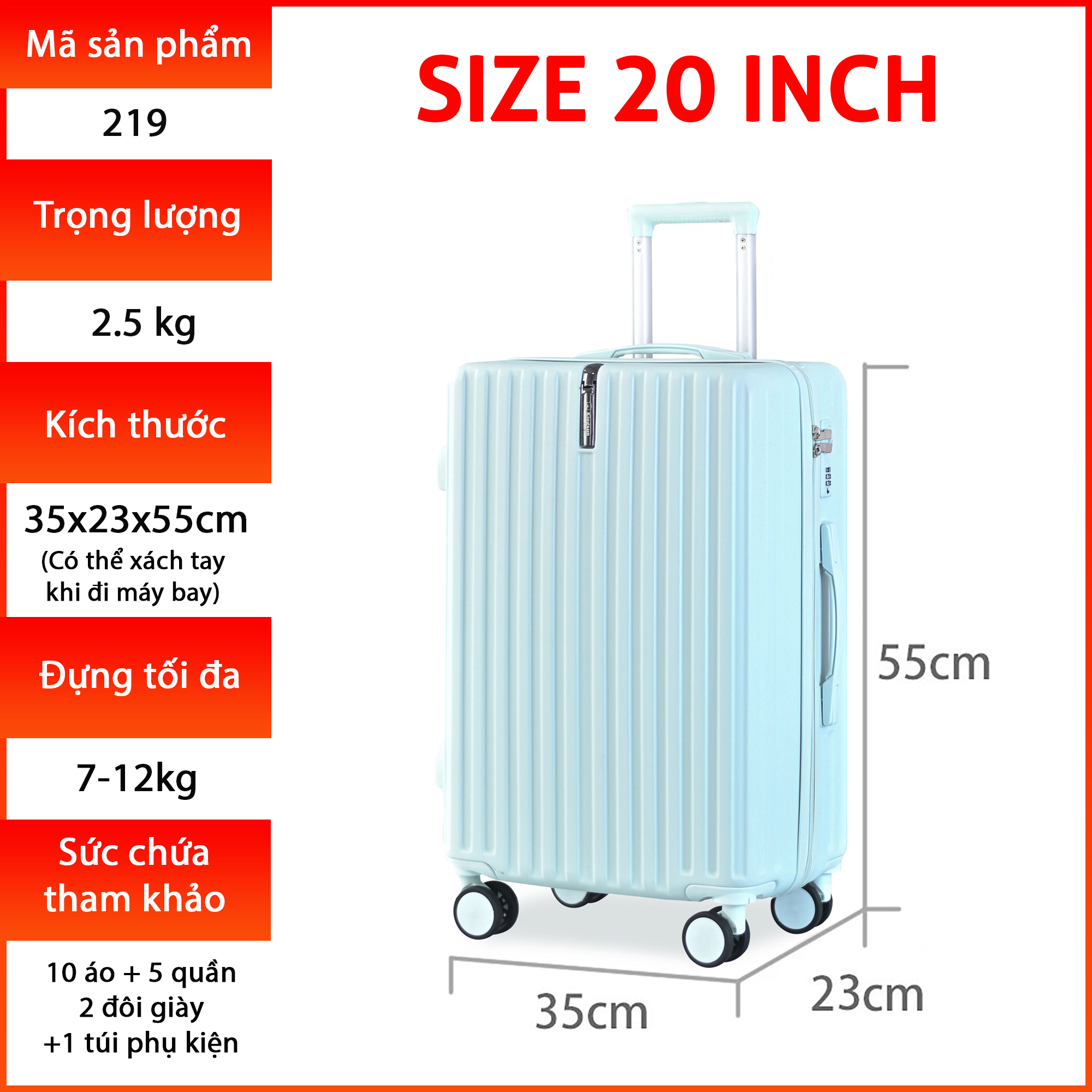��� Size 20: 36.5cm x 25.5cm x 53cm(+/- 2cm), có thể xách tay lên máy bay, sức chứa 7-12kg hành lý, thích hợp cho những chuyến du lịch ngắn ngày 2-4 ngày hoăc đi công tác.