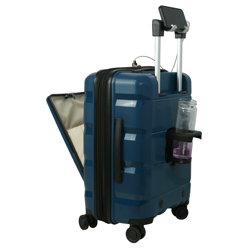 FEATURES - Vertical opening front panel with dedicated 15.6" laptop compartment (cabin size only) - Expandability for increased capacity - Rich, sophisticated interior organization with multiple compartments and pockets - 360-degree rotating double wheel system