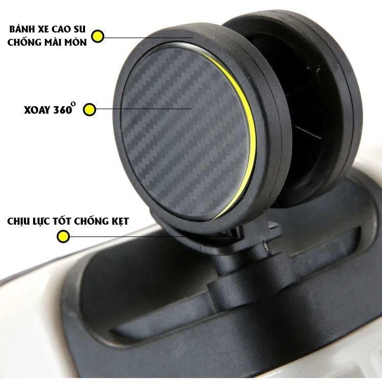 • Bánh xe: xoay 360 độ giúp vali luôn dễ dàng kéo đẩy, không gây tiếng ồn khi di chuyển, không bị mài mòn