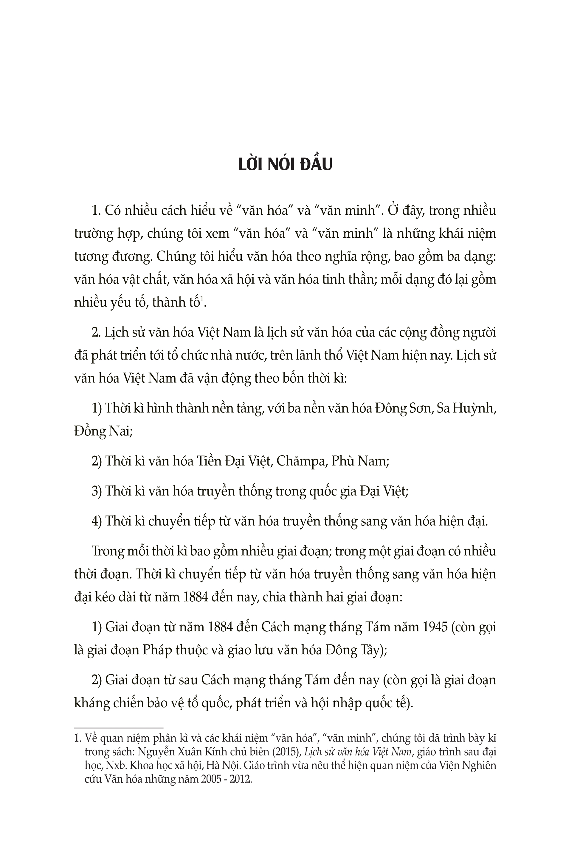 Mua tại TiktokTrình bày khái quát văn hóa vật chất, văn hóa xã hội, văn hóa tinh thần của văn hóa Việt Nam từ ngày độc lập đến hiệp định Giơnevơ (1954) và văn hóa Việt Nam từ sau hiệp định Giơnevơ (1954) đến ngày đất nước thống nhất (1975). Có nhiều cách hiểu về “văn hóa” và “văn minh”. Ở đây, trong nhiều trường hợp, chúng tôi xem “văn hóa” và “văn minh” là những khái niệm tương đương. Chúng tôi hiểu văn hóa theo nghĩa rộng, bao gồm ba dạng: văn hóa vật chất, văn hóa xã hội và văn hóa tinh thần; mỗi dạng đó lại gồm nhiều yếu tố, thành tố. Lịch sử văn hóa Việt Nam là lịch sử văn hóa của các cộng đồng người đã phát triển tới tổ chức nhà nước, trên lãnh thổ Việt Nam hiện nay.