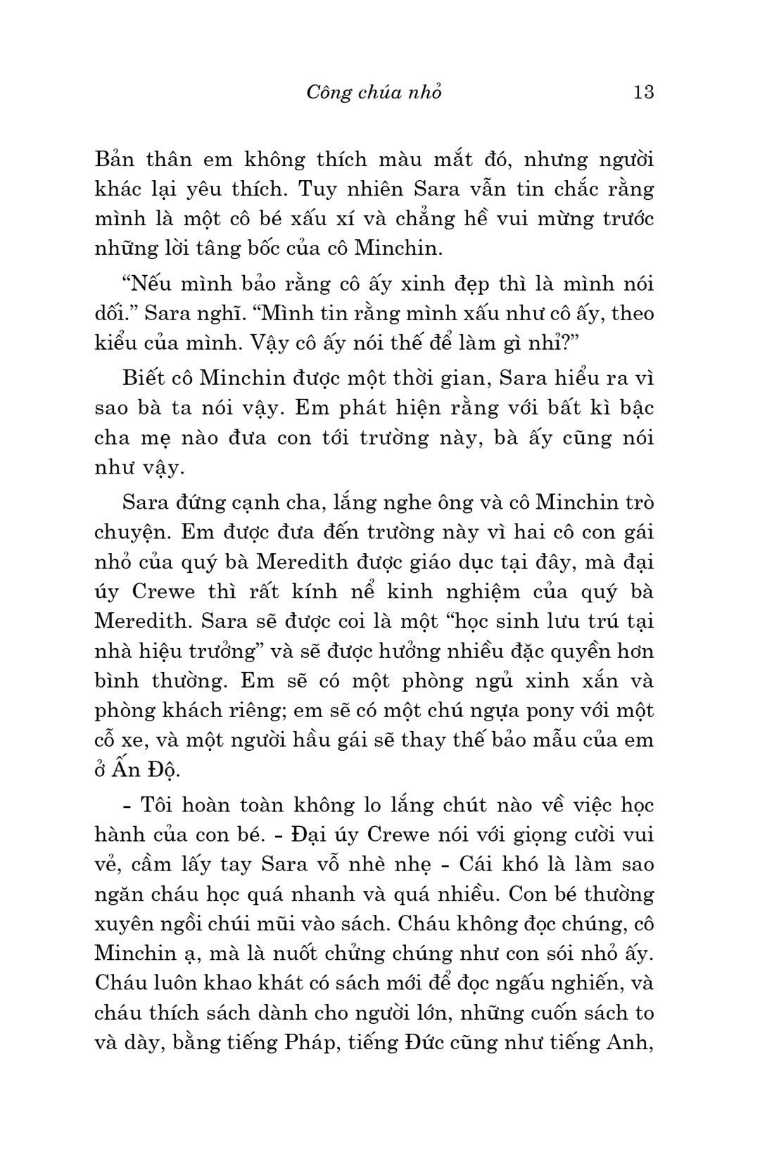 Từ khi ra đời, câu chuyện Công chúa nhỏ đậm màu sắc cổ tích, ca ngợi lòng tự trọng, tình yêu thương và lung linh sắc màu tưởng tượng luôn được nhiều thế hệ thiếu nhi yêu thích. Cuốn sách đã nhiều lần được chuyển thành phim điện ảnh, truyền hình và nhạc kịch.