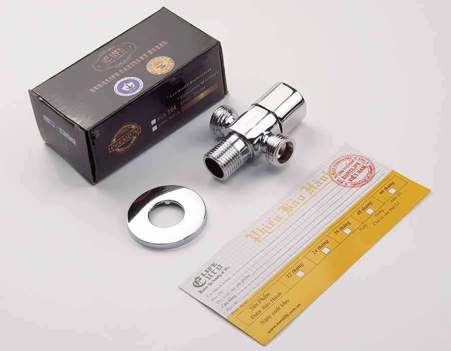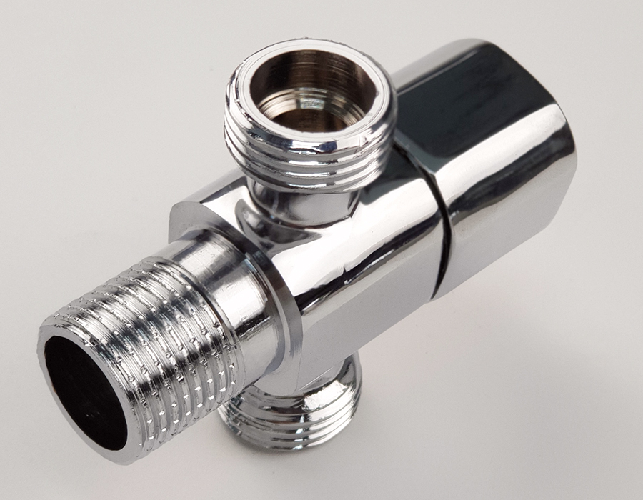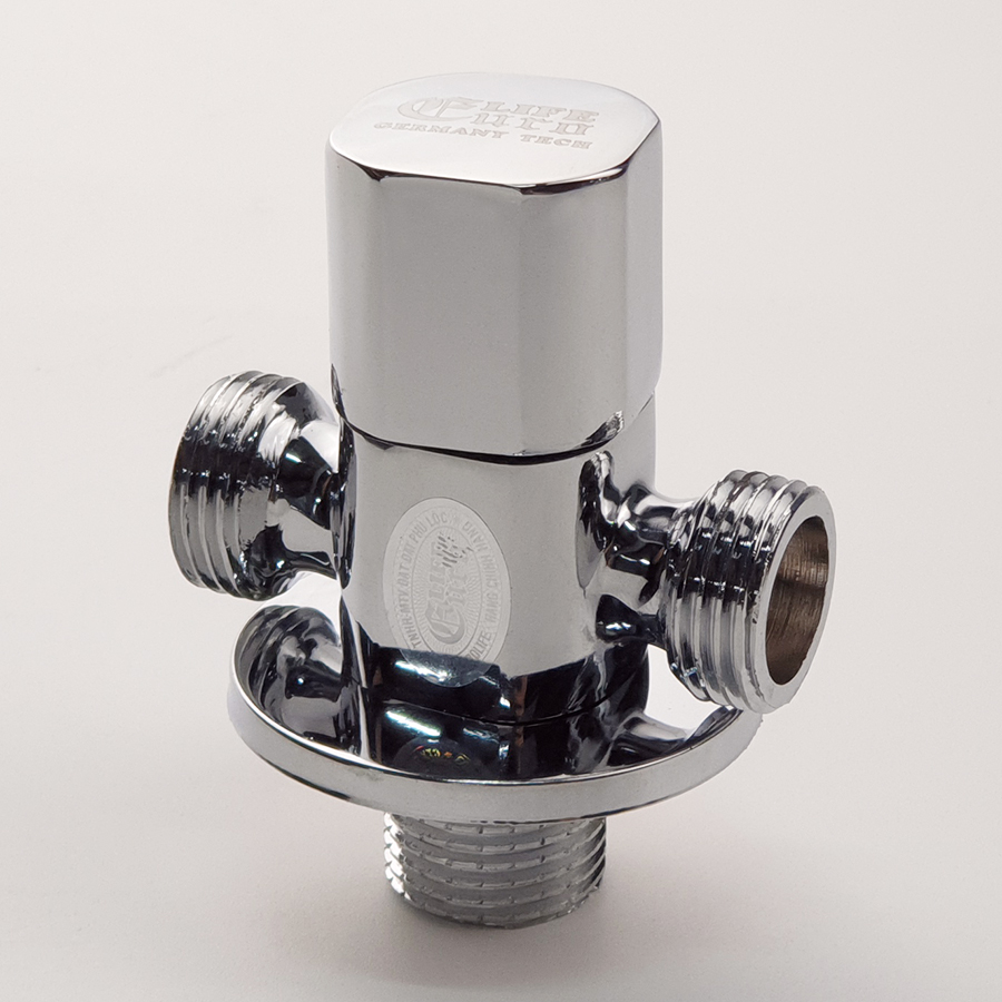 Van khóa chữ T chia hai đường nước 1 ngã cấp nước vào bồn cầu dây xịt vệ sinh, 1 ngã dùm để giảm áp lực nước Thân van được làm bằng đồng mạ chrome,