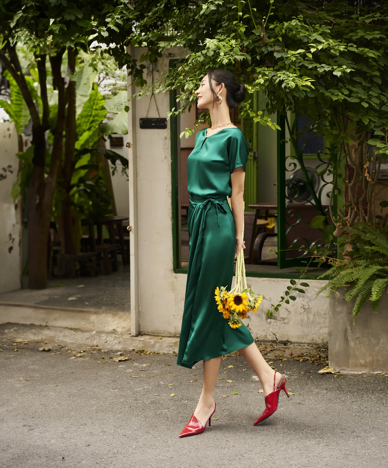 Điểm nhấn của chiếc váy chính là phần xẻ đùi trước táo bạo, giúp tôi khoe khéo đôi chân thon khỏe, dày công tập luyện. Phần thân váy được thiết kế dài trên mắc cá chân giúp tôi cảm thấy cơ thể cân bằng, chân dài, tạo nên sự thanh lịch và duyên dáng. Gam màu xanh ngọc lục bảo mang lại vẻ giàu sang cho người mặc, vì nó gợi nhớ màu sắc của một trong "tứ đại đá quý", viên đá emerald. Từ xa xưa, trong thiên nhiên có rất ít viên đá quý có gam màu xanh rực rỡ như thế này. Chẳng vì vậy mà ngọc lục bảo được trân quý từ hàng nghìn năm đến bây giờ. Thời Phục Hưng tại Ý, màu xanh thắm trên tranh vẽ của các bậc thầy danh họa phải được nghiền ra từ khoáng chất malachite, cũng là một viên đá bán quý được sử dụng trong trang sức. So sánh với sắc nâu từ đất nung, tím từ hoa thiên thảo hay vàng từ chì, giá trị của màu vẽ xanh lá đắt đỏ hơn nhiều. Vì vậy chúng cũng không bị phung phí, được sử dụng khá dè xẻn. Vì lịch sử gắn liền với những viên đá quý, gam màu xanh emerald luôn mang lại cho tôi sự kiêu hãnh khoác lên mình vẻ đẹp lộng lẫy quý phái.
