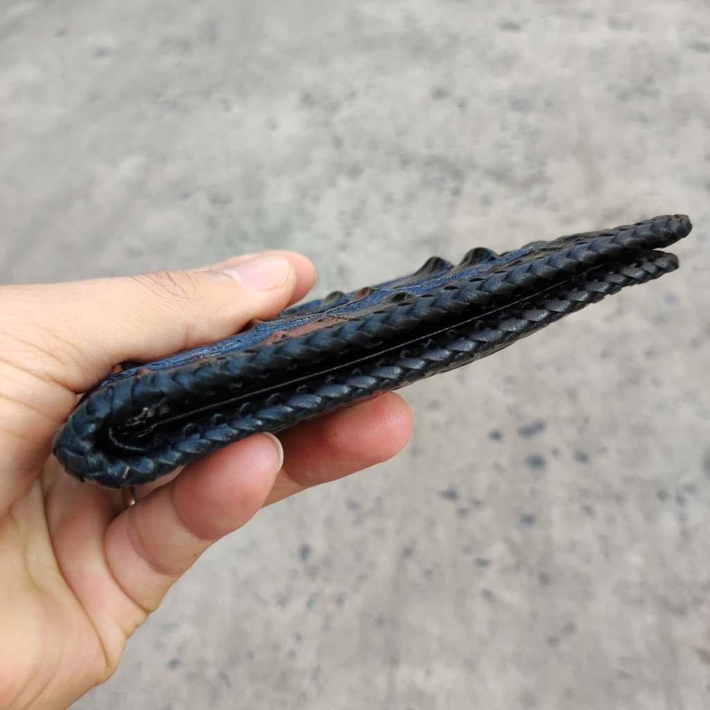 Mặt ngoài của ví làm từ phần gai lưng cá sấu chạy song song rất đẹp. Xung quanh ví được đan viền thủ công đẹp nổi bật và chắc chắn