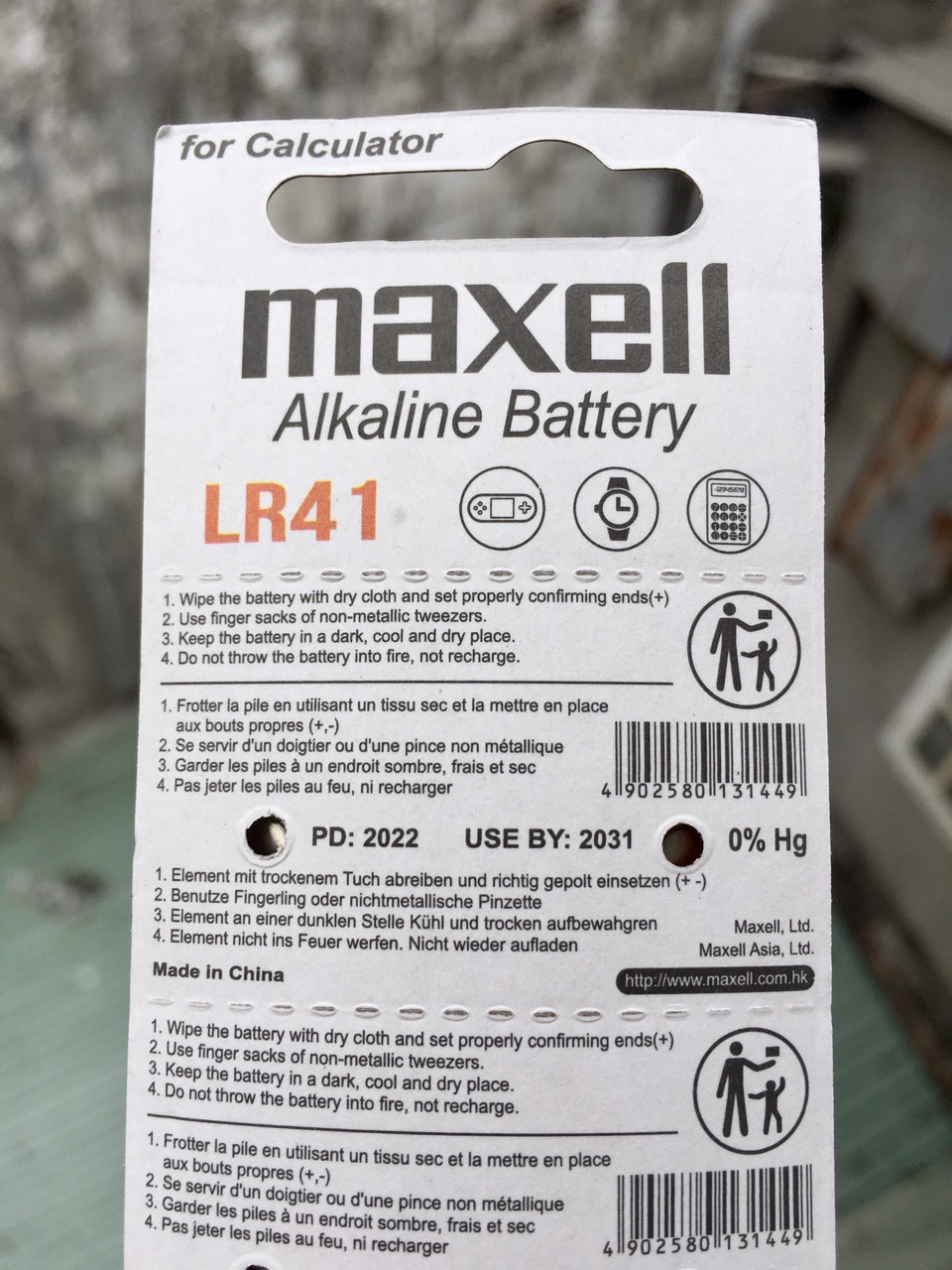 Thông số kĩ thuật: • Thương hiệu: Maxell • Xuất xứ hãng: Nhật Bản • Nơi đóng gói: Trung Quốc • Mã pin: LR41 hoặc AG3 hoặc L736F • Kích cỡ: 7,9 x 3,6mm • Điện áp: 1,5 Volt • Hạn sử dụng: 12/2031 • Đóng gói: 1 vỉ = 10 viên