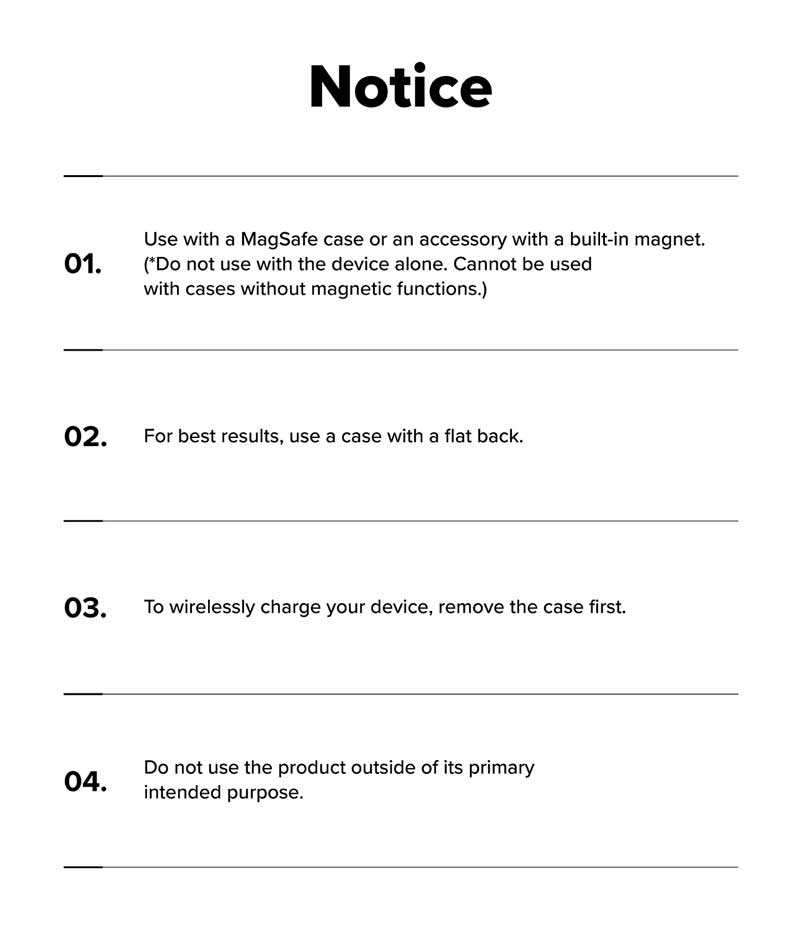 - Sản phẩm cần được dùng với ốp lưng từ tính Magnetic và có mặt lưng phẳng, không gồ ghề. Ốp lưng cần được mua riêng.