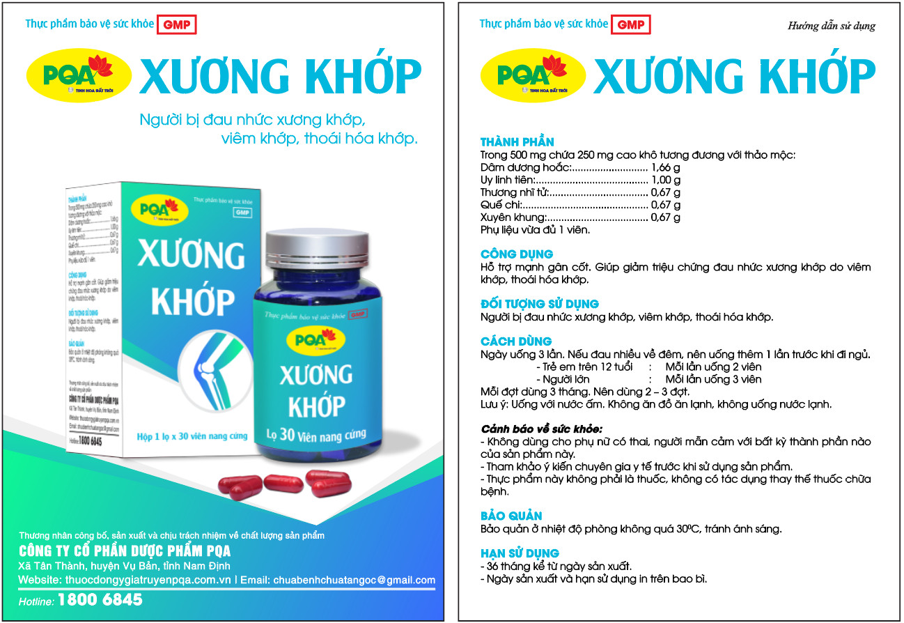 THÔNG TIN PQA XƯƠNG KHỚP Viên nang PQA Xương Khớp hộp 100 viên là dược phẩm thảo dược cho người bị đau nhức xương khớp, viêm khớp, thoái hóa khớp, hỗ trợ mạnh gân cốt, giúp giảm triệu chứng đau nhức xương khớp do viêm khớp, thoái hóa khớp Thành phần PQA Viên nang Xương Khớp Trong 500mg chứa 250mg cao khô tương đương với thảo mộc: Dâm dương khoắc: 1,66g Uy linh tiên: 1,00g Thương nhĩ tử: 0,67g Quế chi: 0,67g Xuyên khung: 0,67g Phụ liệu vừa đủ 1 viên. Công dụng Viên nang Xương Khớp PQA Hỗ trợ mạnh gân cốt. Giúp giảm triệu chứng đau nhức xương khớp do viêm khớp, thoái hóa khớp. Đối tượng sử dụng : Người bị đau nhức xương khớp, viêm khớp, thoái hóa khớp. Cách dùng Viên nang PQA Xương Khớp Ngày uống 3 lần. Nếu đau nhiều về đêm, nên uống thêm 1 lần trước khi đi ngủ. Trẻ em trên 12 tuổi: Mỗi lần uống 2 viên. Người lớn: Mỗi lần uống 3 viên. Mỗi đợt dùng 3 tháng. Nếu dùng 2 – 3 đợt. Lưu ý: Uống với nước ấm. Không ăn đồ ăn lạnh, không uống với nước lạnh. Cảnh báo về sức khỏe: Không dùng cho phụ nữ có thai hoặc đang cho con bú, người mẫn cảm với bất kỳ thành phần nào của sản phẩm này. Tham khảo ý kiến chuyên gia y tế trước khi sử dụng sản phẩm. Thực phẩm này không phải là thuốc, không có tác dụng thay thế thuốc chữa bệnh. Bảo quản: ở nhiệt độ phòng không quá 30 độ C, tránh ánh sáng. Hạn sử dụng: 36 tháng kể từ ngày sản xuất. Ngày sản xuất và hạn sử dụng in trên bao bì. Số XNQC: 2134/2020/XNQC-ATTP Số đăng ký: 5074/2020/ĐKSP
