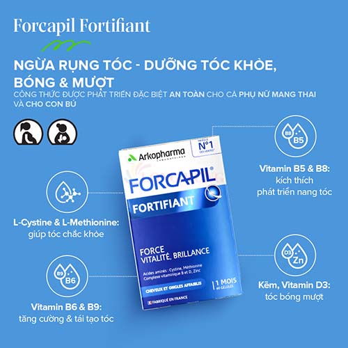 Viên uống Arkopharma Forcapil Fortifiant là giải pháp toàn diện cho tóc và móng. Với công thức giàu vitamin và khoáng chất, sản phẩm giúp nuôi dưỡng, phục hồi tóc hư tổn, giảm gãy rụng và làm móng chắc khỏe, sáng bóng từ sâu bên trong.
