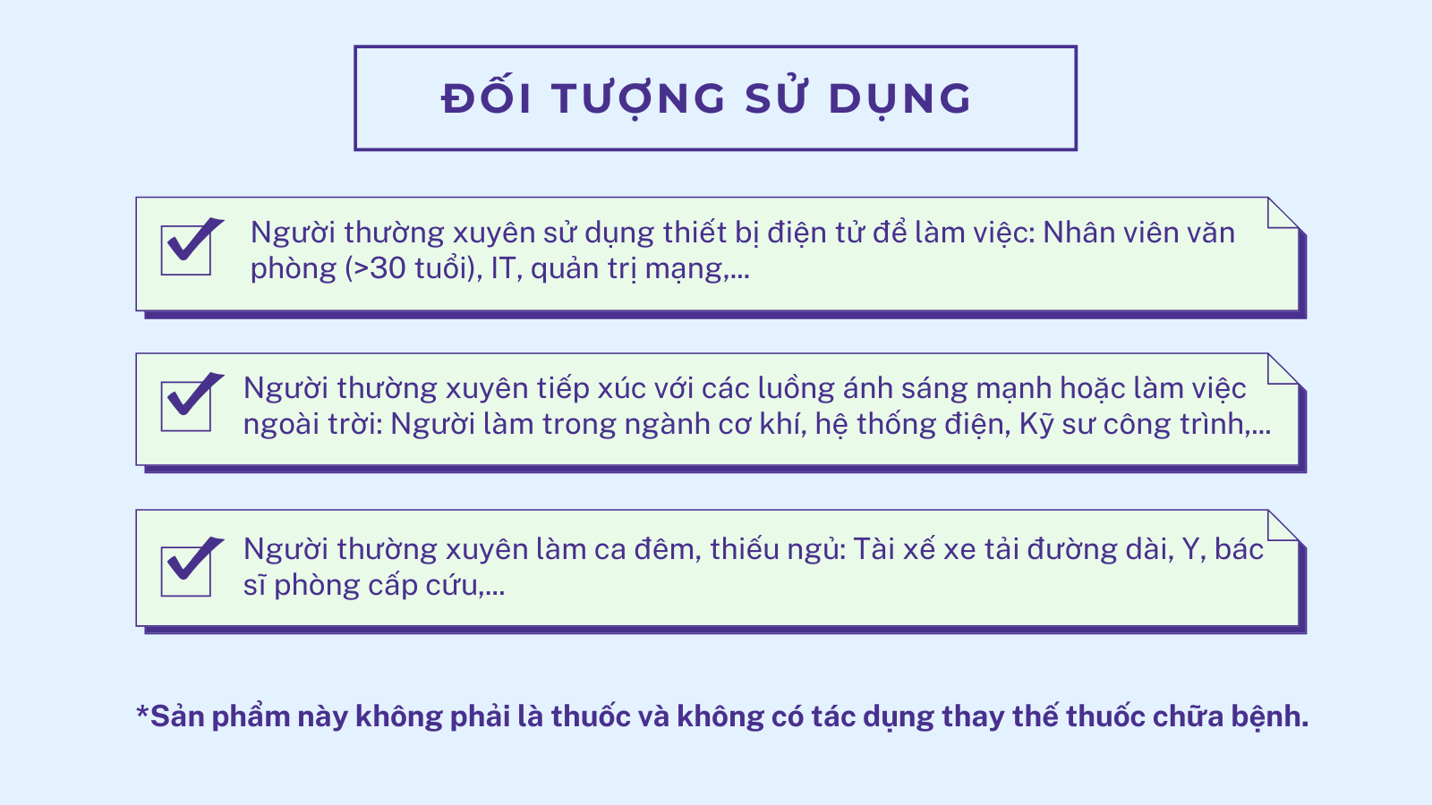 • Bổ sung các dưỡng chất, hoạt chất sinh học tự nhiên, hỗ trợ điều tiết mắt, cải thiện các chứng khô mắt, đau nhức mắt, chảy nước mắt sống.