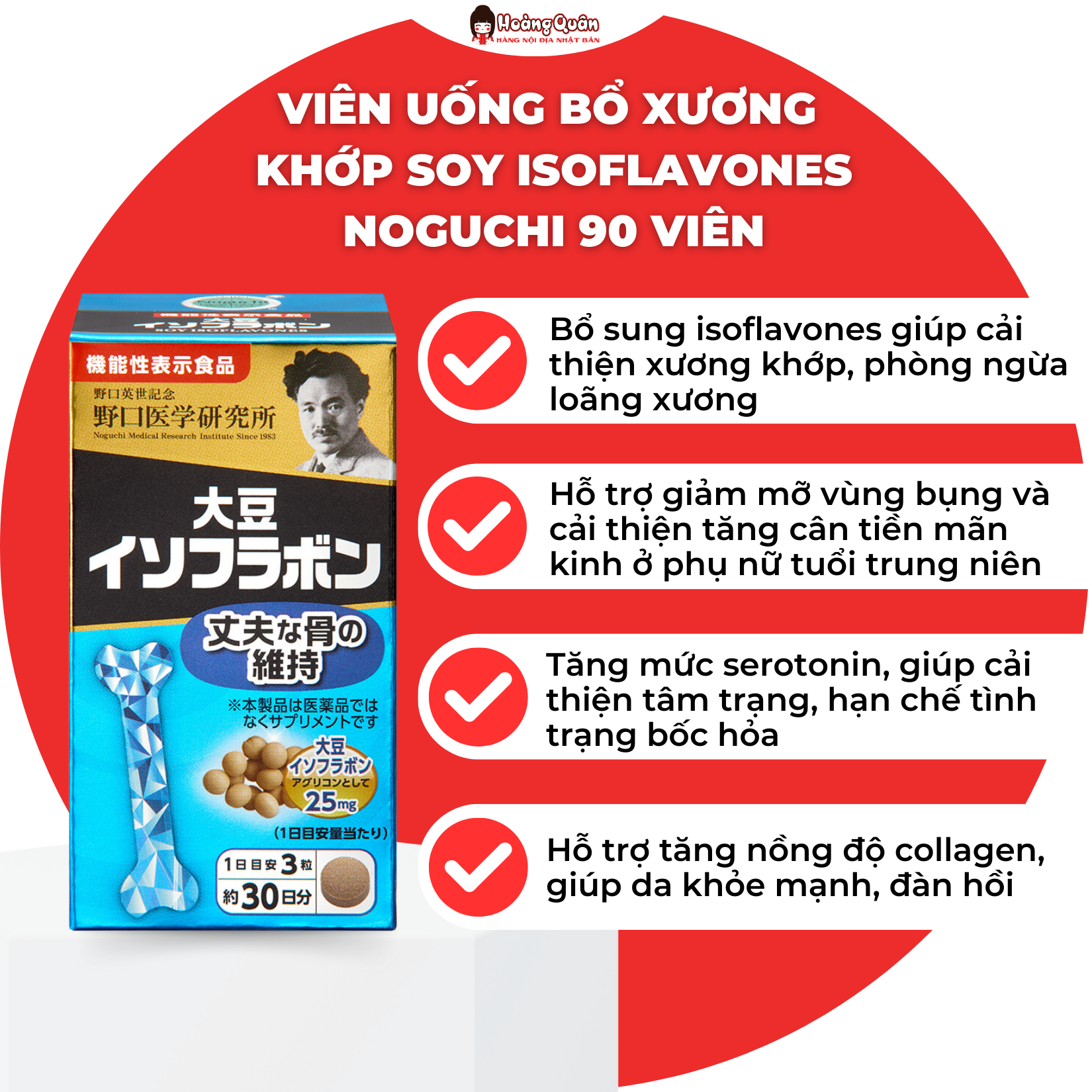 Viên uống chắc xương khớp Soy Isoflavones Noguchi 90 viên là sản phẩm nội địa Nhật Bản, có chứa isoflavone đậu nành, hỗ trợ duy trì thành phần xương, giúp xương chắc khoẻ. Thành phần