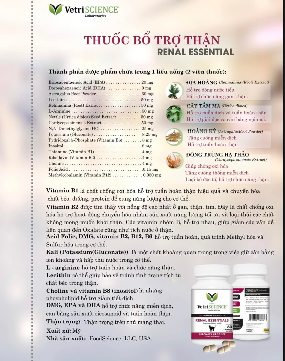 Viên uống Hỗ trợ Tiết niệu & Thận là sản phẩm bổ sung giúp hỗ trợ thận toàn diện. Sản phẩm có chứa các thành phần giúp tối ưu hóa sức khỏe và chức năng của thận; thích hợp sử dụng cho chó và mèo lớn tuổi (chó mèo già) hoặc chó mèo không được cung cấp hay uống đủ nước, đặc biệt là chó mèo gặp các vấn đề về thận và/hoặc cần tăng cường chức năng thận.