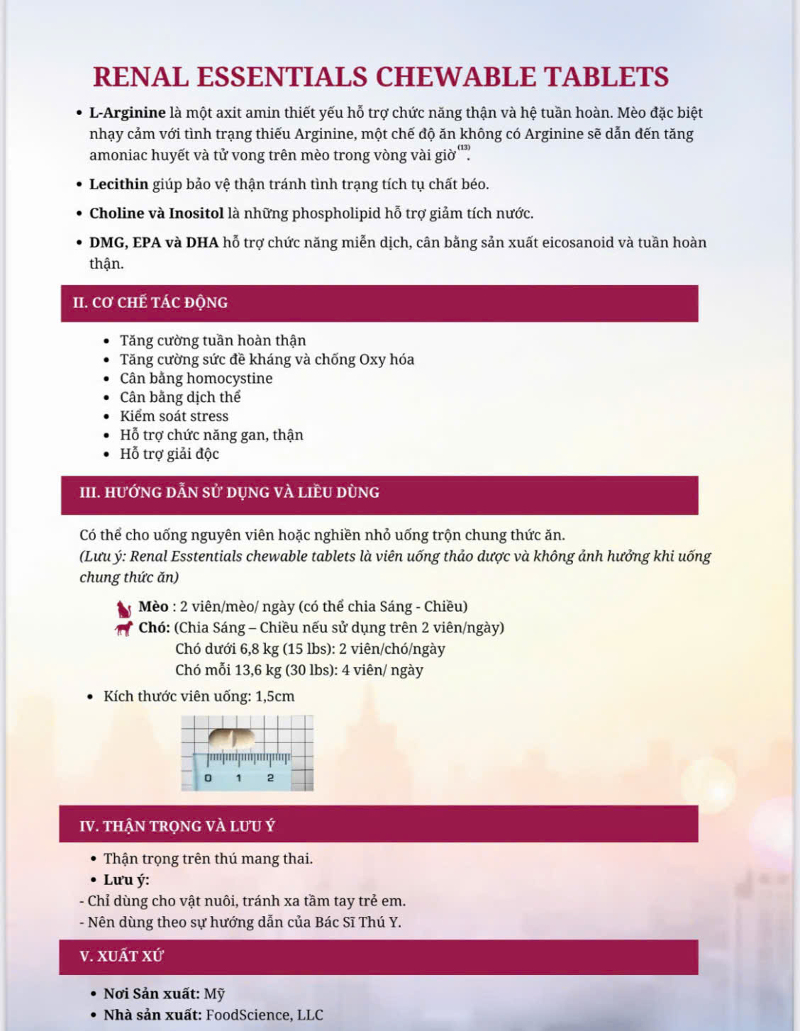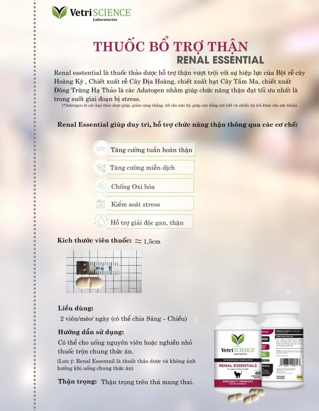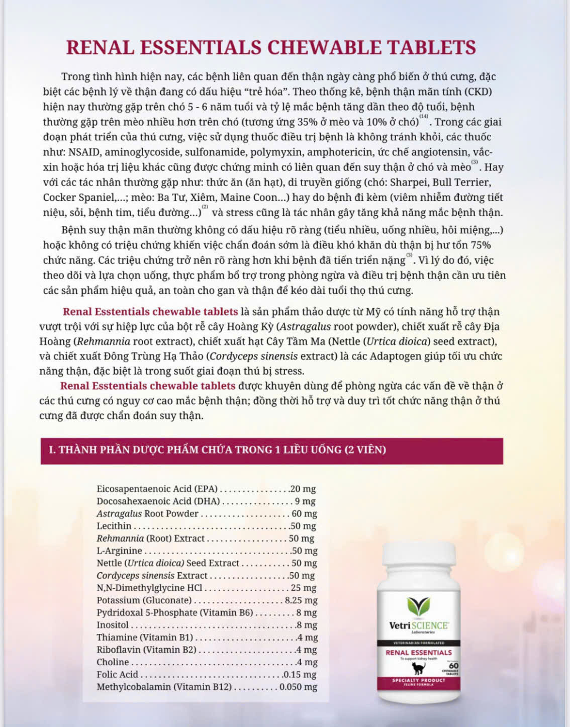 - Xuất xứ: BA LAN -Sản phẩm hỗ trợ miễn dịch chó mèo Sản phẩm giúp hỗ trợ miễn dịch không đặc hiệu cho chó và mèo Dùng cho thú cưng bị căng thẳng như