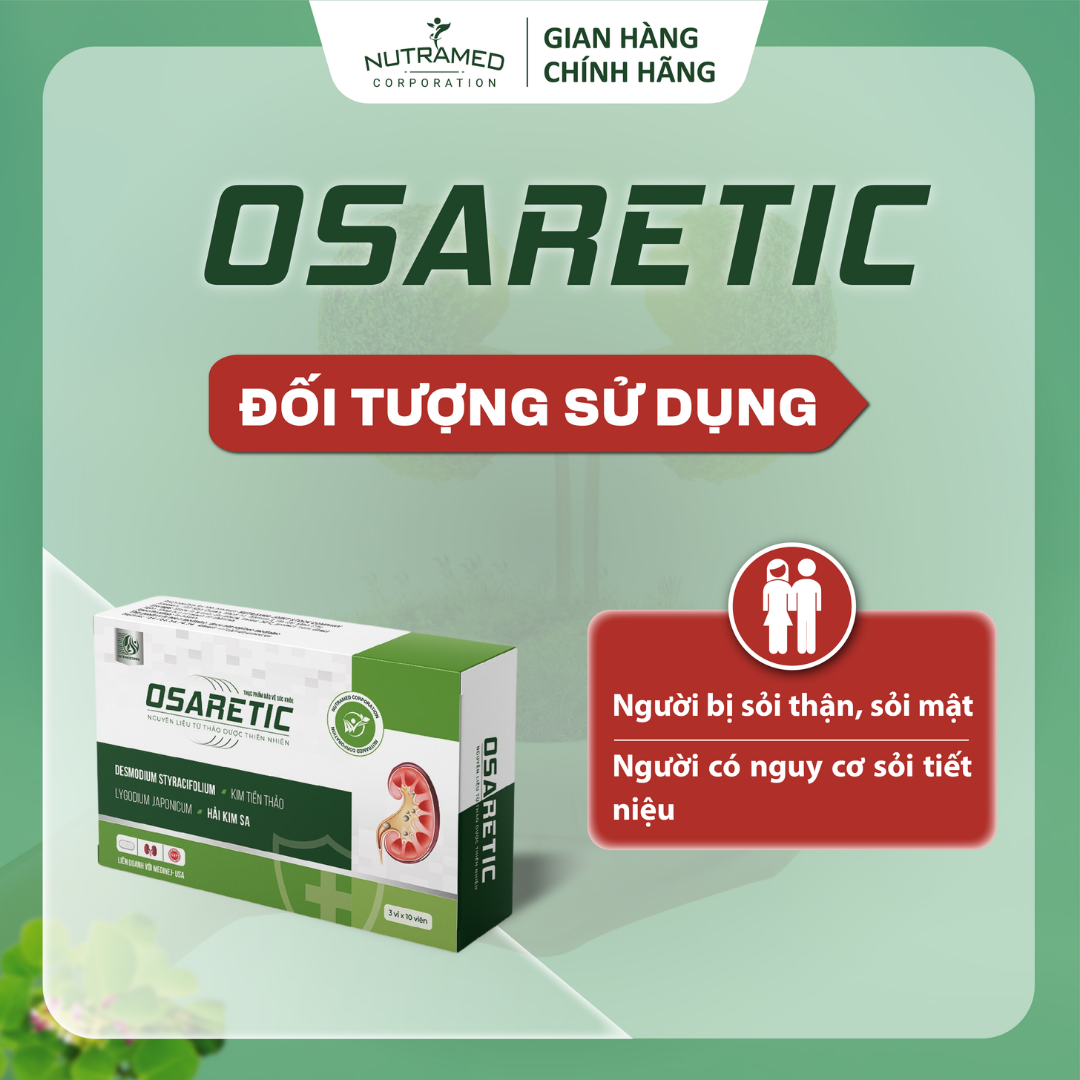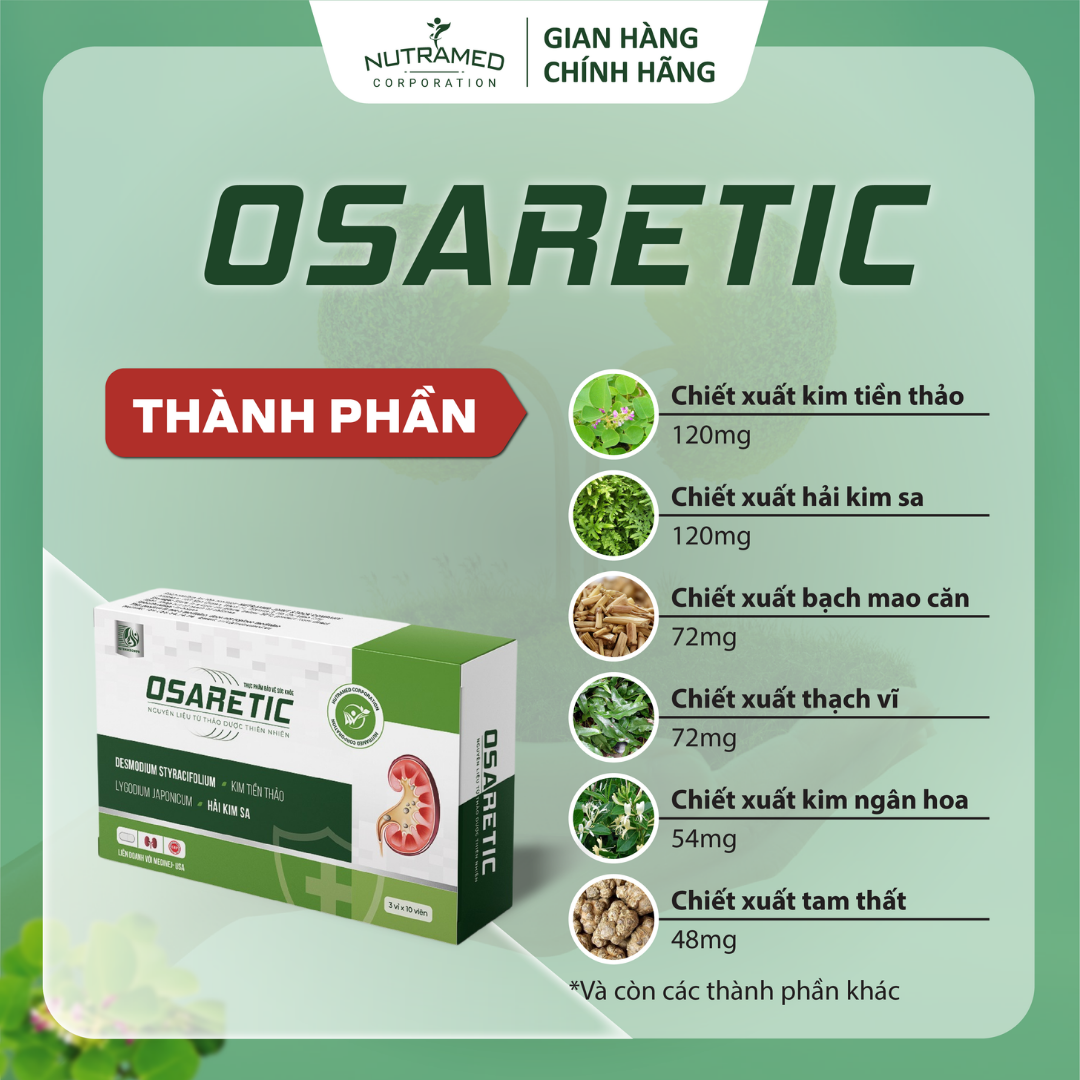 OSARETIC - Giải pháp giúp tăng cường đào thải cặn lắng trên đường tiết niệu, giảm nguy cơ sỏi tiết niệu, sỏi mật THÀNH PHẦN  ️  Desmodium styracifolium extract (chiết xuất Kim tiền thảo); Lygodium japonicum extract (chiết xuất Hải kim sa); Imperata cylindrica extract (chiết xuất Bạch mao căn); Pyrrosia lingua extract (chiết xuất Thạch vĩ); Lonicera japonica extract (chiết xuất Kim ngân hoa); Panax notoginseng extract (chiết xuất Tam thất); Millettia Dielsiana Harms extract (chiết xuất Kê huyết đằng); Orthosiphon aristatus extract (chiết xuất Râu mèo); Dianthus superbus extract (chiết xuất Cù mạch)   CÔNG DỤNG    ️  Giúp lợi tiểu, lợi mật, hỗ trợ tăng cường đào thải cặn lắng trên đường tiết niệu, giúp giảm nguy cơ hình thành sỏi tiết niệu, sỏi mật.     ĐỐI TƯỢNG SỬ DỤNG  ️  Người bị sỏi thận, sỏi mật. Người có nguy cơ sỏi tiết niệu.   HƯỚNG DẪN SỬ DỤNG  ️  Ngày uống 2 lần, mỗi lần uống 1 – 2 viên, uống trước khi ăn.   KHÔNG SỬ DỤNG TRONG TRƯỜNG HỢP  ️  Người mẫn cảm, kiêng kỵ với bất kỳ thành phần nào của sản phẩm.   LƯU Ý  ️  Người có sỏi kích thước lớn, có biến chứng gây chảy máu hay nhiễm trùng cần phải có ý kiến của thầy thuốc khi sử dụng.  ️  Thực phẩm này không phải là thuốc, không có tác dụng thay thế thuốc chữa bệnh.   BẢO QUẢN   ️  Nơi khô ráo, nhiệt độ dưới 30°C, tránh ánh sáng mặt trời.  ️  Để xa tầm tay trẻ em.   THÔNG TIN SẢN PHẨM Tên sản phẩm: NOVASTONE Quy cách: Hộp 3 vỉ x 20 viên. Hạn sử dụng: 36 tháng kể từ ngày sản xuất. Tiêu chuẩn: TCCS   _ NUTRAMED - KHƠI NGUỒN KHOA HỌC TỚI CUỘC SỐNG   Nhà máy đạt chuẩn WHO – GMP. Nguyên liệu được kiểm tra chất lượng khắt khe bởi nhà máy đạt chuẩn GMP.