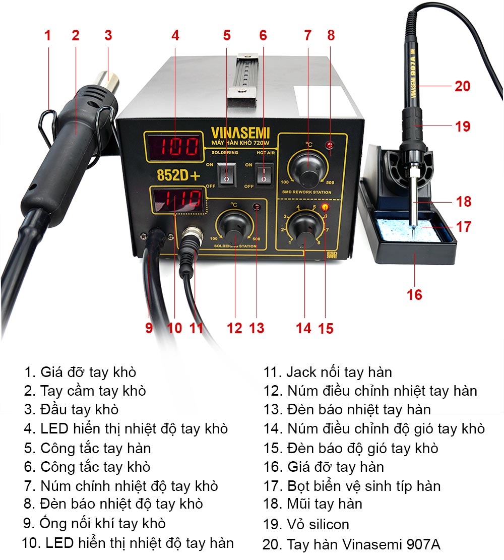 Vinasemi-852D+ là một máy kết hợp giữa hàn và khò, thích hợp cho việc sửa chữa các thiết bị điện tử, dùng cho cá nhân hoặc dùng cho nhà máy sản xuất. Máy hàn khò này được tích hợp led hiển thị nhiệt độ giúp chúng ta để dễ dàng quan sát.