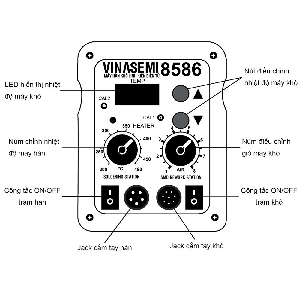 Vinasemi8586 là một máy kết hợp giữa hàn và khò, thích hợp cho việc sửa chữa các thiết bị điện tử, dùng cho cá nhân hoặc dùng cho nhà máy sản xuất, đặc biệt là có chế độ tự ngắt khi đủ nhiệt để duy trì mức nhiệt độ ở mức cần thiết.