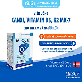Vitamin D3K2 MK7 (MenaQ7) Và Canxi MEQUIB OST (Hộp 60 Viên) - Tăng Hấp Thu Canxi, Phát Triển Chiều Cao THÀNH PHẦN SẢN PHẨM: -Vitaminn K2 (Menaquinone-7 từ MenaQ7) 90mcg. -Vitamin D3 150IU. -Trucal D7 - Nguồn canxi và khoáng chất natri, kali, magie, sắt, phốt pho được tách chiết từ sữa (chứa 24% Canxi) 417mg. -Inulin 25mg.     CÔNG DỤNG SẢN PHẨM: -Giúp bổ sung canxi, Vitamin K2 và Vitamin D3 cho cơ thể. -Hỗ trợ xương răng chắc khỏe, giúp giảm nguy cơ còi xương và phát triển chiều cao ở trẻ em, giảm nguy cơ loãng xương ở người lớn.         ĐỐI TƯỢNG SỬ DỤNG: -Trẻ còi xương hoặc thanh thiếu niên đang trong giai đoạn phát triển chiều cao, tăng nhu cầu canxi. -Phụ nữ chuẩn bị mang thai, đang mang thai và cho con bú; đang tuổi tiền mãn kinh cần bổ sung canxi do chế độ ăn bị thiếu hụt. -Người cao tuổi, người hạ canxi huyết, chuột rút, tê bì chân tay do thiếu canxi.   HƯỚNG DẪN SỬ DỤNG: -Trẻ từ 2 đến 10 tuổi: Uống 1-2 viên/lần, ngày 2 lần. -Trẻ trên 10 tuổi và người lớn: Uống 2 viên/lần, ngày 2 lần. -Trẻ em dưới 2 tuổi tham khảo ý kiến bác sĩ trước khi dùng. -Thời gian sử dụng: Cùng bữa ăn, dùng hàng ngày ít nhất 3-6 tháng.