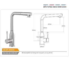 Vòi cố định cổ hình bầu dục xoay 360 độ nóng lạnh inox Tundo Boss BV6222 360*55*320 mm Hai đường nước nóng lạnh, vòi xoay 360 độ.