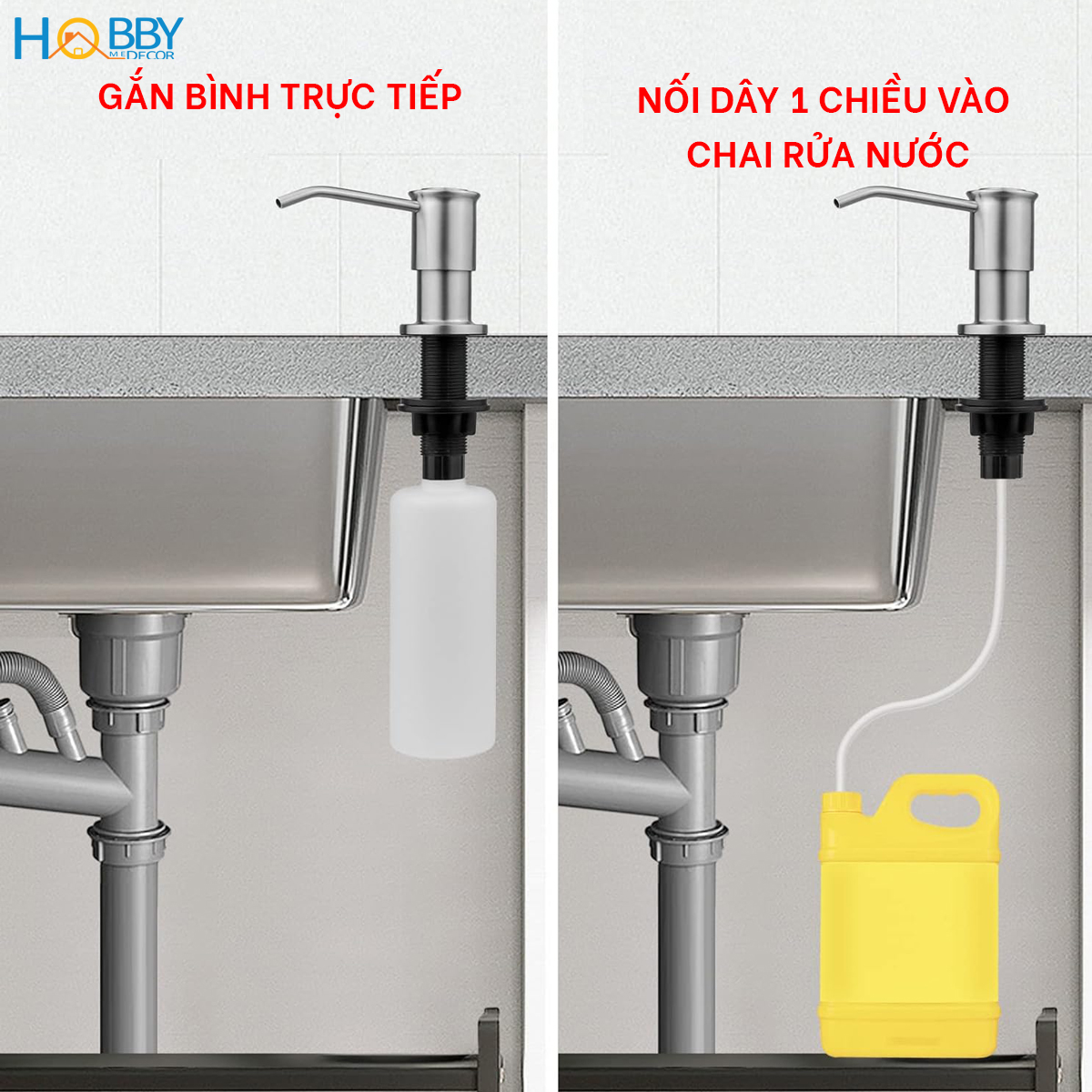 Phụ kiện đi kèm: Bình đựng nước rửa chén 500ml hoặc dây dẫn 120cm nối với chai nước rửa chén