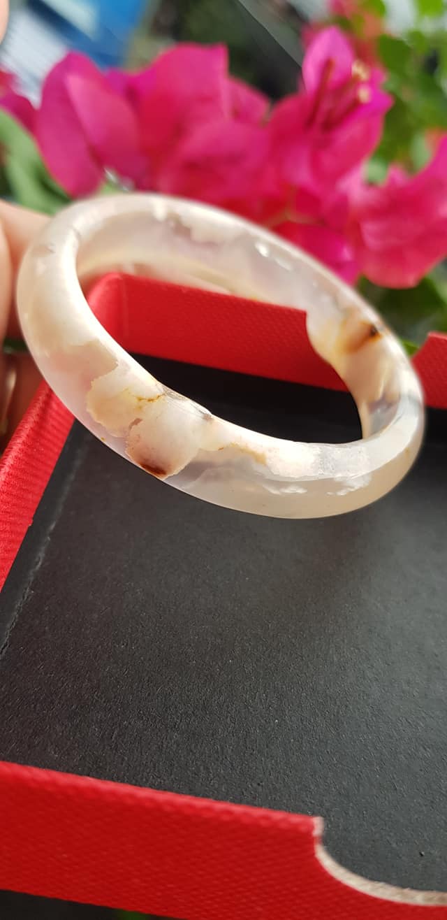 Vòng tay phong thuỷ Nữ Bản Hẹ Đá Mã Não trắng vàng nhẹ bông hoa bóng đẹp Vòng tay Nữ Ni 48mm x Cao 11mm x dầy 6mm Nữ tay nhỏ cân nặng 30kg -