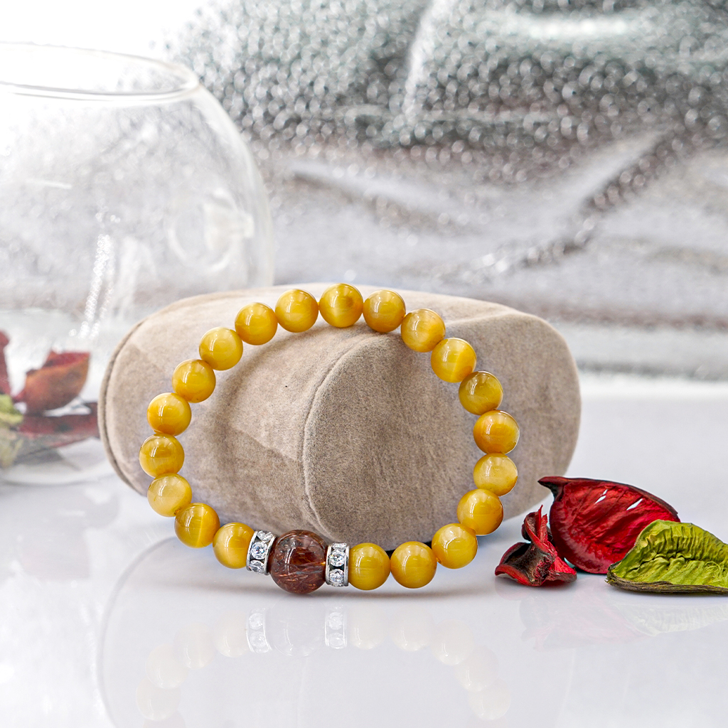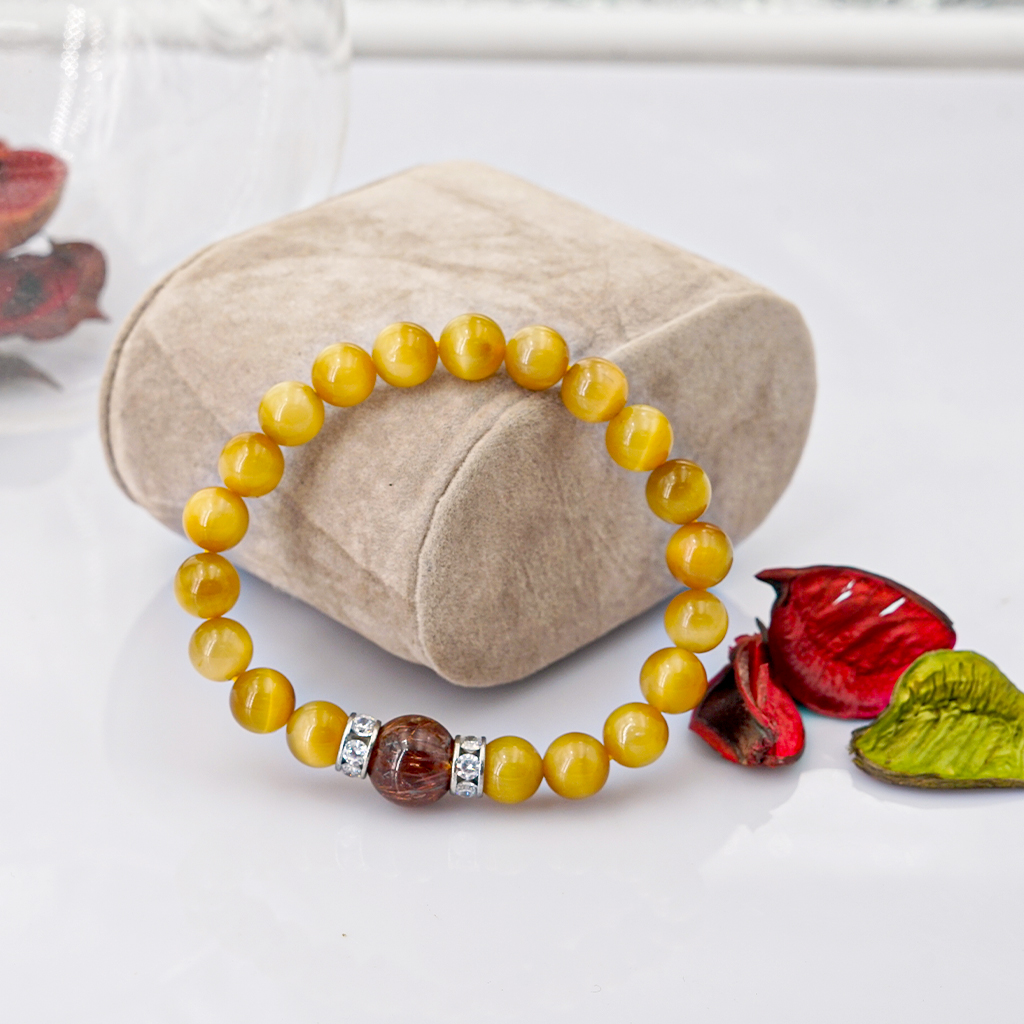 Vòng tay phongg thủy Mắt hổ vàng tâm 8mm + Thạch Anh Tóc nâu by Anqlo là sản phẩm được chế tác tinh xảo, có độ hoàn thiện cao bởi các nghệ nhân lâu năm