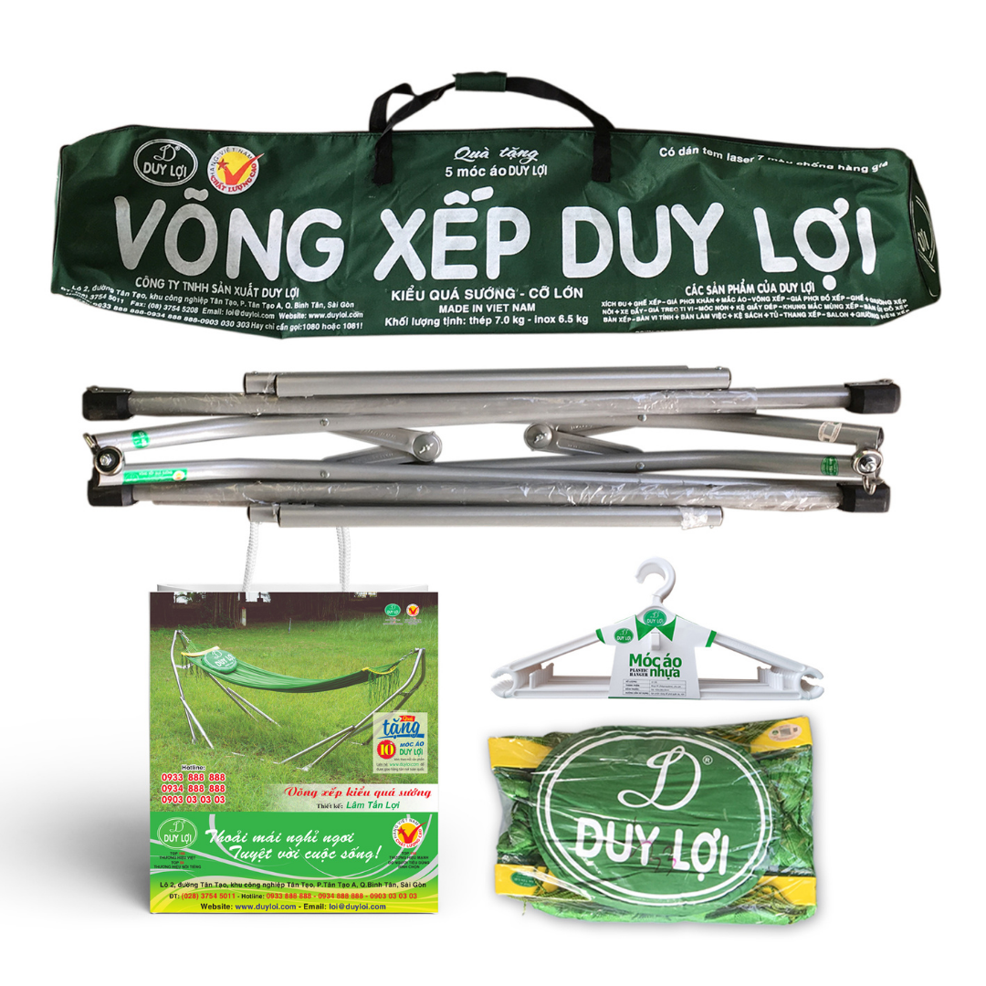 Sản phẩm bao gồm : - Khung võng xếp - Võng lưới lớn, chiều dài phần lưới nằm khoảng 1,7m. - Qùa tặng 10 móc áo kép nhựa cao cấp Duy Lợi Kích thước khung
