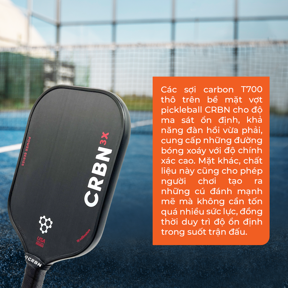 VỢT PICKLEBALL VENDY SUPER POWER Mặt vợt được làm từ 3 lớp carbon T700 và 1 lớp sợi thủy tinh với độ nhám phù hợp, tạo ra 1 bề mặt cực chuẩn, giúp xử lý