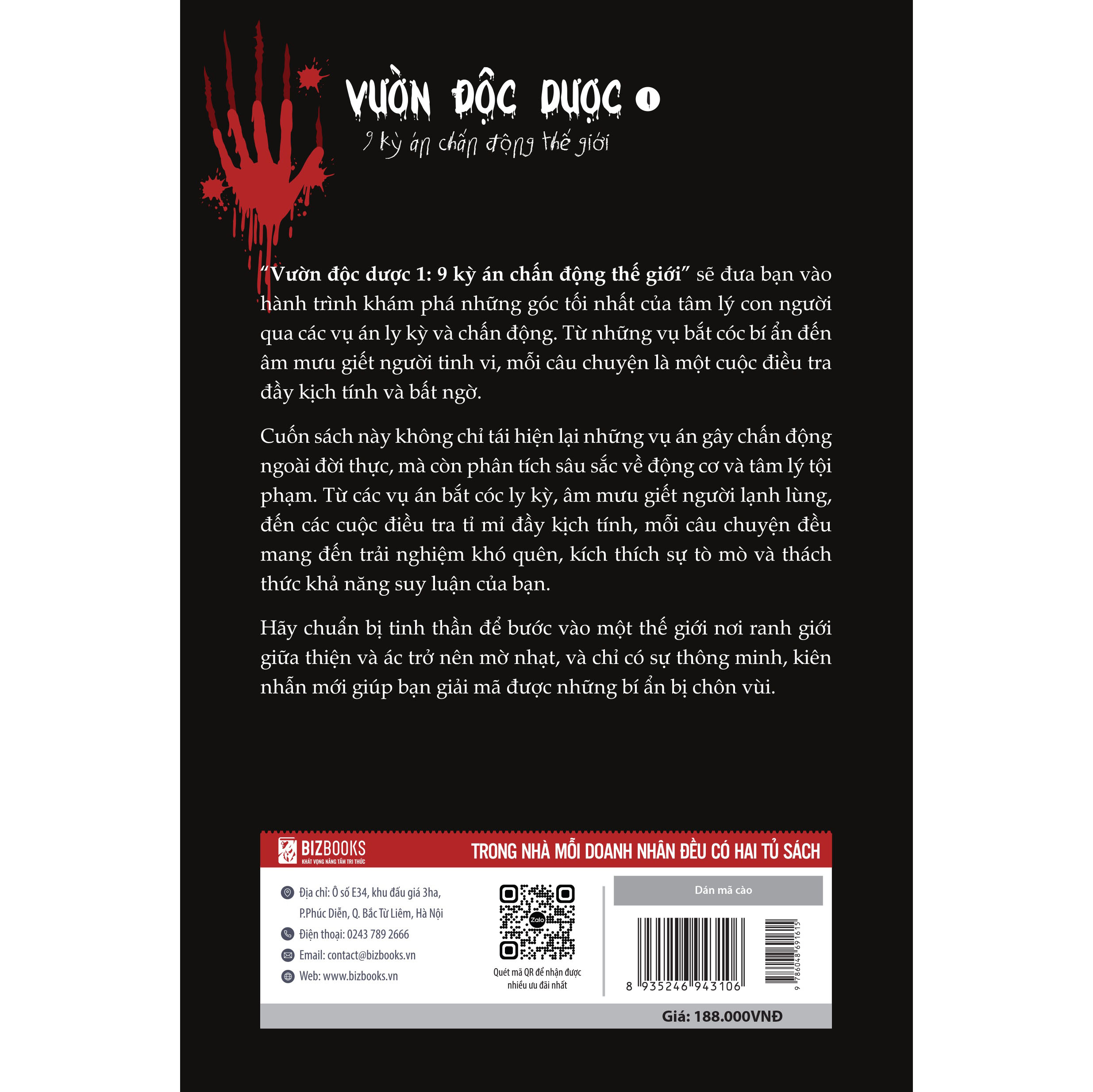 Tóm tắt nội dung Nội dung cuốn sách Vườn độc dược 1: 9 kỳ án chấn động thế giới Chương 1: Vụ án trong ngôi nhà kinh hoàng ở Pháp Năm 2011, tại Nantes, Pháp, gia đình Bá tước Xavier Dupont de Ligonnès gồm sáu thành viên và hai chú chó đột ngột biến mất. Sau nhiều lần khám xét, cảnh sát phát hiện thi thể của vợ con Xavier bị chôn dưới sân sau nhà, nhưng Xavier thì mất tích. Trong quá trình điều tra, nhiều bằng chứng chỉ ra Xavier là hung thủ, và vụ án này trở thành một trong những vụ án bí ẩn và kinh hoàng nhất nước Pháp. Gia đình Xavier trước đây sống cuộc sống hạnh phúc, nhưng thực tế Xavier đang gặp khó khăn tài chính nặng nề và cuộc hôn nhân không hạnh phúc. Điều này dẫn đến hành động cực đoan của ông ta, được cho là giết hại cả gia đình để tránh phải đối mặt với sự sụp đổ hình ảnh bản thân và thất bại trong mắt người khác. Dù có nhiều cuộc tìm kiếm, Xavier vẫn bặt vô âm tín. Các giả thuyết cho rằng Xavier có thể đã tự sát hoặc đang trốn ở một nơi nào đó. Vụ án gây chấn động dư luận và cho đến nay, vẫn chưa có câu trả lời cuối cùng về số phận của Xavier. Chương 2: Vụ án mất tích của bé gái Caylee Pháp y nhanh chóng xác nhận, hài cốt chính là cô bé Caylee đã mất tích trong nửa năm qua. Thi thể được bọc trong một túi rác màu đen, đặt cùng một tấm chăn nhỏ trong túi vải bạt màu trắng. Nếu Caylee thực sự chết đuối, tại sao George lại phải dùng băng dính bịt miệng và mũi của thi thể trước khi vứt bỏ xác? Nếu không phải George, thì ai sẽ làm điều đó? Chương 3: Bí ẩn về hai mẹ con mất tích Có khả năng hai mẹ con đã trèo thang thoát hiểm ra khỏi tòa nhà (nơi không có camera). Do lo sợ kẻ bám đuôi vẫn còn đó, cô đã không quay lại lấy xe máy mà bắt taxi cùng con gái đi đến một nơi xa. Rất có thể tài xế đã chở họ sau đó không quan tâm đến tin tức và cũng không nói với ai về việc này. Nếu hai mẹ con đã xảy xuống biển ở một nơi hẻo lánh nào đó, thì việc đến nay vẫn chưa tìm thấy thi thể là hoàn toàn có thể. Vậy thì thi thể của họ có thể ở đâu? Chương 4: Tân nương trong vách tường Đến 9 giờ tối, vì Annie Le không về nhà và không thể liên lạc được, một trong những người bạn cùng phòng của cô đã gọi điện báo cảnh sát. Annie Le đã bị tấn công tình dục và đánh đập dã man ngay trong chính phòng thí nghiệm của mình, sau đó bị siết cổ đến chết. Vậy hung thủ là ai? Động cơ nào đã khiến kẻ thù ác ra tay tàn nhẫn với Annie Le như vậy? Chương 5: Vụ án “những cậu bé ếch” mất tích ở Hàn Quốc Cảnh sát bắt đầu điều tra hành trình của năm đứa trẻ trước khi mất tích. Hơn 11 năm sau ngày định mệnh, bố mẹ của chúng nhận tin từ cảnh sát, thông báo rằng hài cốt của bọn trẻ đã được tìm thấy trên núi Waryong. Hai hộp sọ của hai đứa trẻ đã bị phong hóa rõ rệt, hư hại và không còn nguyên vẹn. Ba hộp sọ còn lại có những lỗ thủng rất rõ ràng. 31 năm trôi qua, hung thủ vẫn chưa bị đưa ra ánh sáng. Chương 6: Học sinh “si mê” theo dõi cô giáo suốt 15 năm Ming Sen Shiue xuất thân từ một gia đình trí thức thực thụ. Thuở thiếu thời, cậu ta đã bộc lộ một số hành vi lệch lạc như ném đá vào xe cộ và ph óng hỏa trong căn hộ của người lạ. Nam thanh niên độ tuổi trẻ, cảm mến một cô giáo trẻ trung. Tuy nhiên, sự “si mê” của Ming Sen Shiue ngày càng quá đà và dần trở nên biến thái, cưỡng hiếp hoặc quan hệ tình dục tập thể. Khi những ảo tưởng được “nâng cấp” cũng không thể thỏa mãn dục vọng nội tâm nữa, Ming Sen Shiue quyết định biến những ảo tưởng này thành sự thật. Chương 7: “Sát thủ Bikini” trên đường mòn Hippie Sarah, một nữ sinh viên trẻ đầy triển vọng, bị tấn công và sát hại ngay tại ký túc xá của mình. Vụ án đã làm dấy lên làn sóng phẫn nộ trong cộng đồng, đặc biệt là trong giới sinh viên. Cuộc truy lùng kẻ thủ ác kéo dài suốt nhiều năm, với nhiều nghi phạm bị thẩm vấn và nhiều đầu mối bị bỏ ngỏ. Cuối cùng, nhờ sự kiên trì của một điều tra viên, danh tính thật sự của kẻ giết người mới được phát hiện, nhưng sự thật này lại gây sốc cho tất cả mọi người vì kẻ thủ ác là một người không ai ngờ tới. Chương 8: Kỳ án Hoàng Na ở Singapore Vụ án mất tích của cô bé người Hoa, Hoàng Na, xảy ra vào năm 2004 tại Singapore. Vụ án này gây chấn động và được truyền thông Singapore liên tục đưa tin trong nhiều tuần liền. Thi thể nạn nhân không chỉ được bọc trong 9 lớp túi ni lông mà thùng giấy chứa thi thể cũng không được dán kín bằng băng dính nhằm ngăn mùi phát tán. Sau ba tuần tìm kiếm không ngừng nghỉ, kết cục bi thảm của cô bé khiến nhiều người không khỏi bàng hoàng và đau xót. Chương 9: Cô gái Shari bị bắt cóc ngay trước cửa nhà Shari vẫn mặc nguyên bộ quần áo lúc bị bắt cóc; Pháp y ước tính cô đã bị giết trong vòng 12 giờ sau k