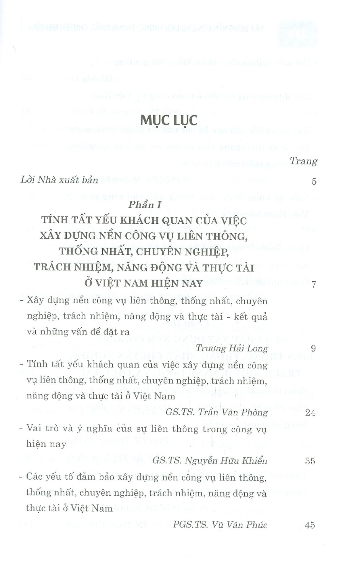 Cuốn sách gồm 23 bài viết của các nhà khoa học, nhà nghiên cứu, nhà quản lý đã phân tích, luận giải những vấn đề đặt ra đối với nền công vụ Việt Nam hiện nay và yêu cầu đổi mới, nâng cao hiệu quả hoạt động của nền công vụ, trên cơ sở đó, các tác giả đề xuất phương hướng, giải pháp nhằm tiếp tục xây dựng nền công vụ liên thông, thống nhất, chuyên nghiệp, trách nhiệm, năng động và thực tài, đáp ứng yêu cầu phát triển đất nước trong giai đoạn hiện nay, tầm nhìn đến năm 2030 và năm 2045.