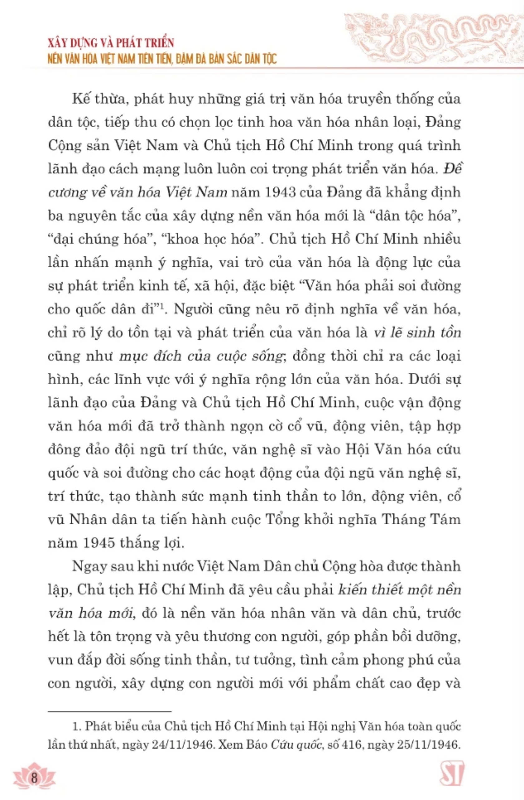 Nhằm hệ thống sự lãnh đạo, chỉ đạo của Đảng, đứng đầu là đồng chí Tổng Bí thư Nguyễn Phú Trọng, về xây dựng và phát triển nền văn hóa Việt Nam tiên tiến, đậm đà bản sắc dân tộc, giúp các ngành, các cấp, các địa phương, cán bộ, đảng viên, Nhân dân xác định rõ quan điểm, mục tiêu, định hướng, nhiệm vụ phát triển văn hóa, để văn hóa thực sự trở thành nền tảng tinh thần, động lực và nguồn lực nội sinh cho phát triển đất nước, Ban Tuyên giáo Trung ương chủ trì, phối hợp với Bộ Văn hóa, Thể thao và Du lịch, Nhà xuất bản Chính trị quốc gia Sự thật xuất bản cuốn sách Xây dựng và phát triển nền văn hóa Việt Nam tiên tiến, đậm đà bản sắc dân tộc của đồng chí Tổng Bí thư Nguyễn Phú Trọng.