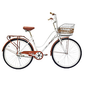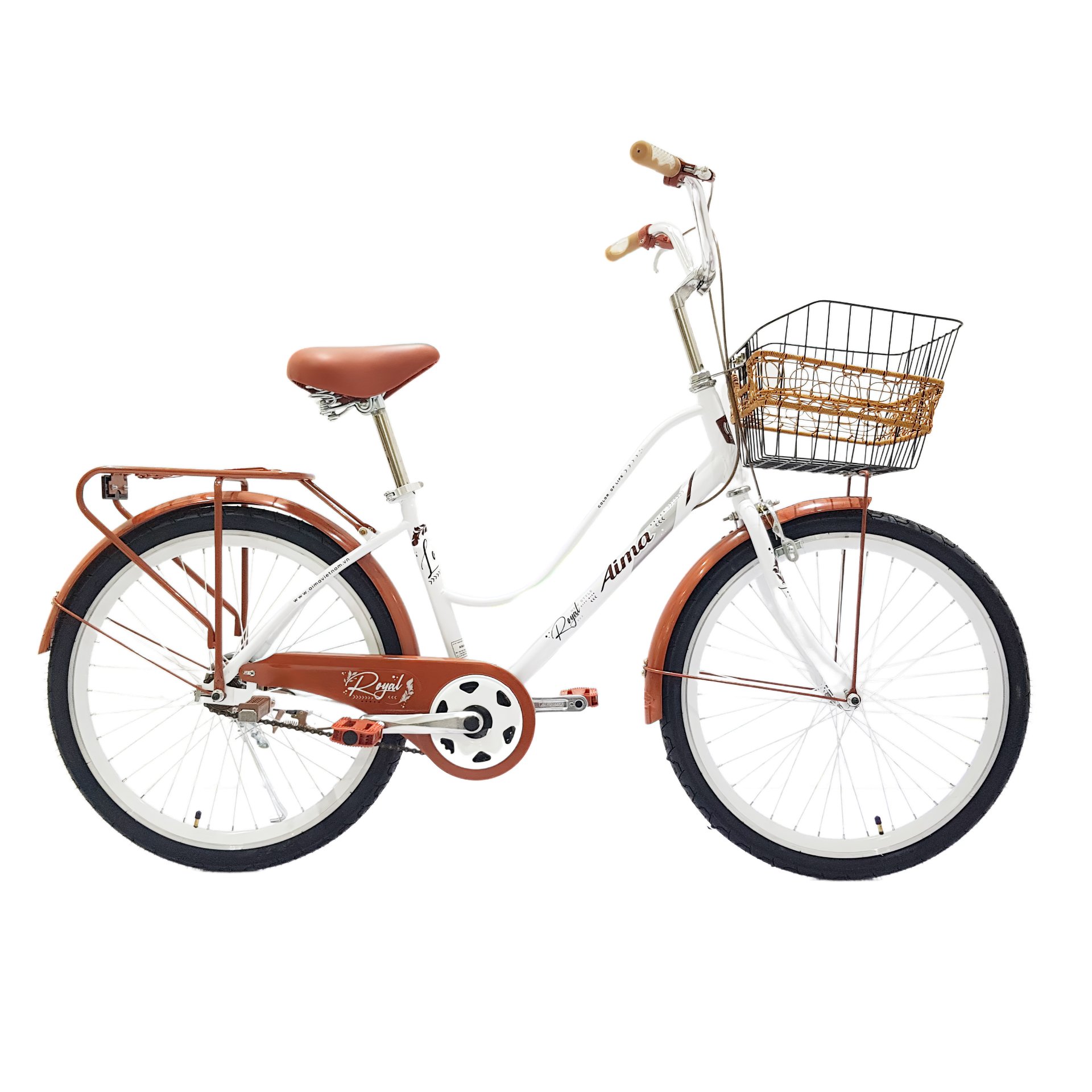 Xe đạp thời trang nữ AIMA ROYAL Xe đạp học sinh AIMA ROYAL với thiết kế khung sườn cong tạo cảm giác nhìn mềm mại nhưng thực chất khung được làm từ chất liệu sắt cao cấp rất bền và cứng cáp. Ghi đông xe dáng truyền thống, thuận tiền cầm lái. Phần tay cầm có bọc lớp nhựa và cao su nhiệt dẻo giúp tạo độ êm khi cầm nắm tay. +Với hệ thống tay phanh nhẹ, dễ dàng bóp nhả, dây phanh bọc nhựa an toàn, chạy gọn dọc theo khung xe. Vành xe đạp học sinh AIMA ROYAL bằng nhôm nhẹ sáng bóng nan hoa bằng thép được đan và căn chỉnh chính xác tạo độ cân bằng cũng như kết cấu chuẩn nhất cho toàn bộ bánh xe. +Bàn đạp nhựa với trục thép cứng cáp, bộ đùi đĩa bằng sắt bền kiên cố. Với bộ truyền động đĩa đơn tốc 33 răng và líp đơn tốc 16 răng cơ bản giúp xe chạy êm và lướt nhẹ trên đường. Hộp xích bằng sắt bền giúp bảo vệ bộ nhông xích tránh bị bụi bẩn, tăng tuổi thọ và tính thẩm mỹ cho xe. +Xe có yên ngồi có rộng và mềm, yên xe đạp học sinh AIMA ROYAL có lớp đệm êm và được bọc bên ngoài với lớp da mềm chống thấm nước, dễ dàng vệ sinh, lau chùi. Baga phía sau được gắn chắc chắn cùng bên cạnh xe có gác chân phụ giúp người ngồi sau có tư thế ngồi xe thoải mái nhất. +Giỏ xe bằng sắt bọc nhựa, phía dưới có khung đỡ chịu lực, người sử dụng có thể thoải mái đựng các món đồ mình muốn.