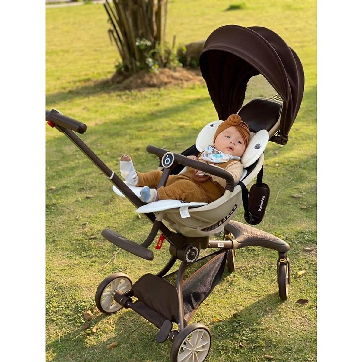• Thiết kế thời trang: Baobaohao V18 thực sự gây ấn tượng mạnh bởi thiết kế vô cùng đẹp mắt, hài hòa mà không lòe loẹt như những mẫu xe đẩy trung quốc khác. Với những bạn trẻ thích trà sữa hay những bậc tiền bối thích nhâm nhi một tách cà phê sữa thì màu sắc của V18 thực sự quá giống với cốc đồ uống bạn hay thưởng thức. Khung xe, bánh xe và mái che được sơn màu nâu đồng bộ. Còn ghế ngồi xe thì màu trắng sữa giúp xe nổi bật nhưng không quá phản cảm, gây chú ý.