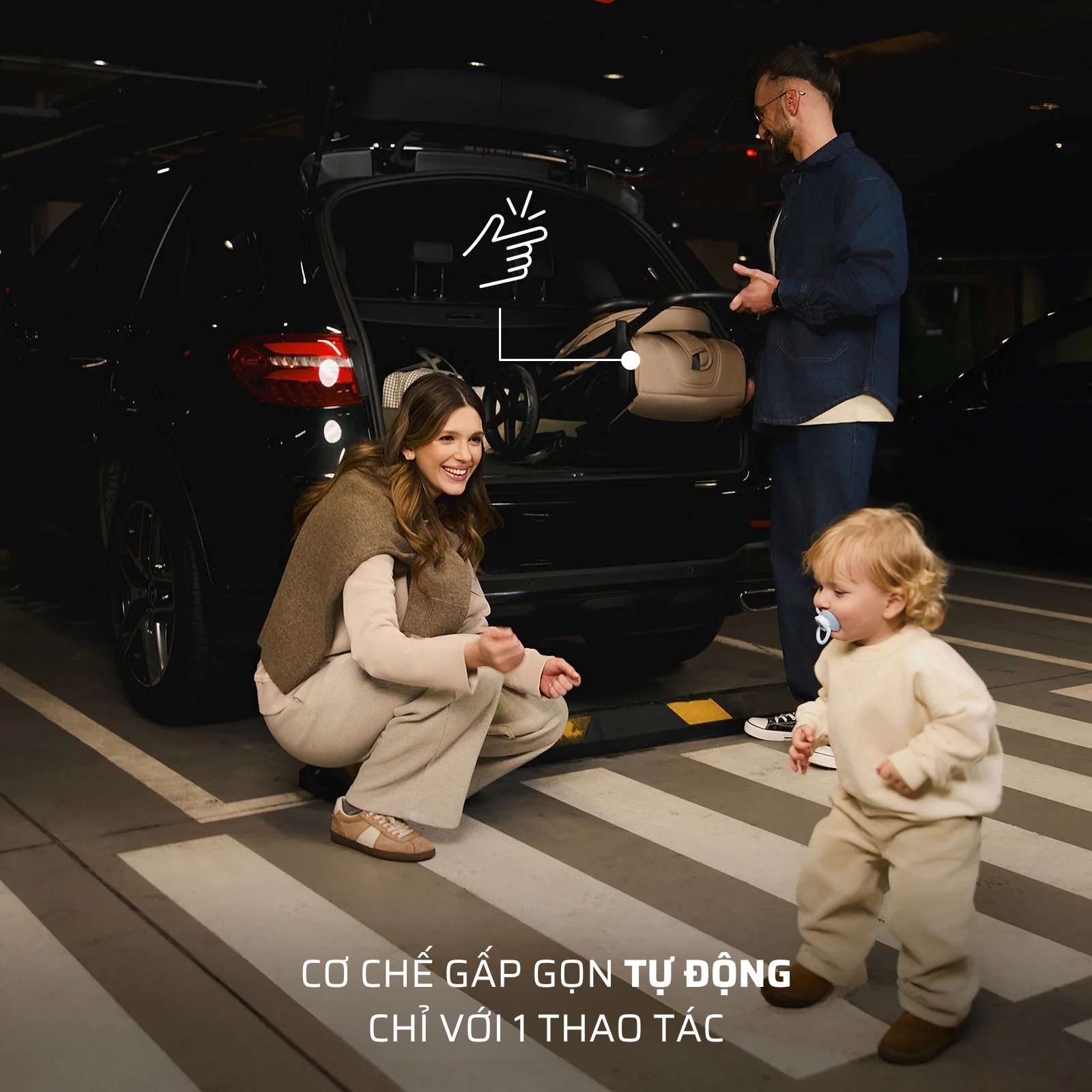 Cấu trúc nhẹ và khả năng gấp tự động giúp dễ dàng cất giữ và vận chuyển. Kích thước nhỏ gọn của xe đẩy sau khi gấp lại cho phép cất trữ xe đẩy một cách thuận tiện trong cốp xe hoặc tủ quần áo khách sạn.