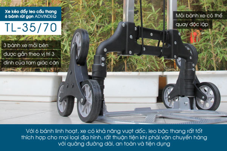Tổng quan sản phẩm:Xe Kéo Đẩy Leo Cầu Thang 6 bánh rút gọn ADVINDEQ TL-35/70 trọng tải leo cầu thang 35 kg, đường bằng 70kg được làm bằng hợp kim nhôm có độ bền cao, trọng lượng xe 3.5kg cực n...