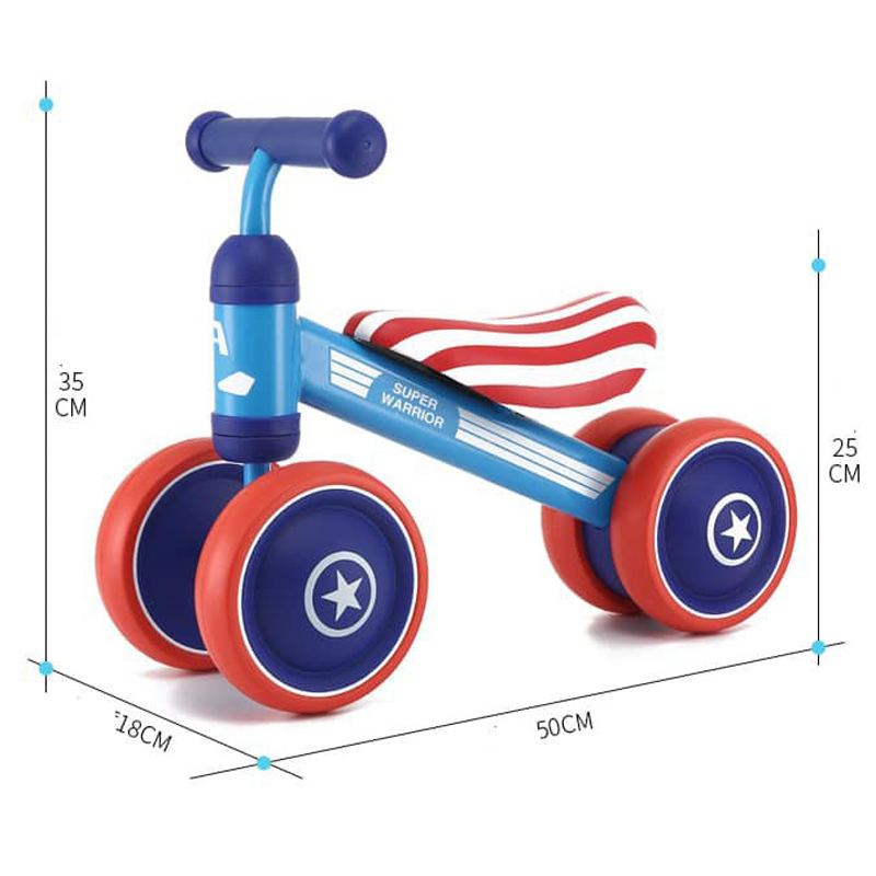 - Với 3 màu có sẵn, bố mẹ có thể dễ dàng lựa chọn phù hợp với sở thích, tính cách của con: Màu xanh kết hợp đỏ dành cho bé trai thích đội trưởng Mỹ Bản Lĩnh (Captain America) Màu vàng tinh nghịch khỏe khoắn cho bé. Màu hồng nữ tính đáng yêu cho bé gái. Chất liệu an toàn, thiết kế ngộ nghĩnh: – có thiết kế khung xe bằng kim loại không gỉ bền chắc theo thời gian sử dụng. Bề mặt xe nhẵn mịn, sơn phủ không độc hại với các góc cạnh bo tròn không sắc nhọn, không làm ảnh hưởng đến sức khỏe của trẻ. – Bánh xe được chế tạo từ nhựa đúc an toàn, cứng cáp với độ chịu lực cao, làm tăng thêm độ chắc chắn cho kết cấu xe. – Bánh xe và tay cầm bọc đệm mềm mại, êm ái, bảo vệ sức khỏe và tạo sự thoải mái khi bé lái xe. – Xe chòi chân Duke nổi bật với các màu sắc dễ thương, điệu đà và hình ảnh chú vịt ngộ nghĩnh, màu xanh sọc cờ, in trên trục lái và yên xe, chắc chắn sẽ khiến bé vô cùng thích thú khi vui chơi. Di chuyển an toàn, thoải mái: – có thiết kế ghế ngồi dài bọc đệm mềm mại mang lại cho bé cảm giác thoải mái và dễ chịu mỗi khi vui chơi. – Tay cầm vừa vặn, bọc lớp êm ái chống trơn trượt, được thiết kế nằm ngang, tương thích với chiều cao yên giúp bé điều khiển chuyển hướng xe rất dễ dàng, từ đó tăng khả năng vận động và phản xạ linh hoạt của trẻ nhỏ. – Xe chòi chân kết cấu 4 bánh hoạt động trơn tru, đặc biệt chắc chắn hơn với bánh đúp phía sau. Vành bánh xe được làm từ nhựa đúc, lốp xe đặc, mềm, chống bị đâm thủng bởi các chướng ngại vật trên đường đi. Tăng khả năng vận động của bé: – Xe chòi chân là giải pháp tốt giúp bé phát triển khả năng vận động ngay từ những năm tháng đầu đời. Thông qua động tác đẩy chân, sự điều hướng của đôi tay bé không chỉ được hỗ trợ phát triển thể lực, sự dẻo dai của hệ xương khớp mà còn rèn luyện cho bản thân khả năng nhanh nhạy, nhạy bén, từ đó tác động tích cực tới sự phát triển của tư duy và não bộ sau này. – Với Xe chòi chân – Tập cân bằng 4 bánh cao cấp, giờ đây bé cùng bạn bè có thể cùng nhau tạo nên một cuộc đua gay cấn để có được những giờ phút vui chơi vận động thật thư giãn và sảng khoái. Thông tin kích thước: – Kích thước xe (D x R x C): 50 x 21 x 35 cm. – Đường kính bánh xe: 15 cm – Chiều cao yên ngồi: 21 cm – Chiều dài tay cầm: 21 cm.