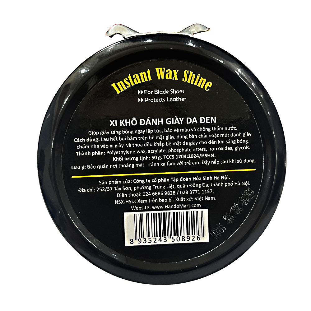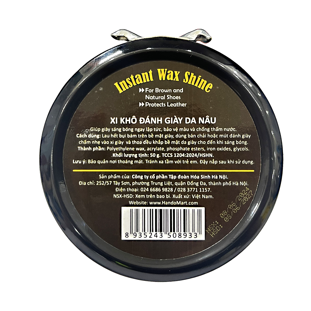THÔNG TIN SẢN PHẨM Tên SP: Xi khô đánh giày da, đồ da Hando 50g (Đen / Nâu) Thành Phần : Polyethylene wax , acrylate, polysorbate esters , iron oxides , glycols Trọng lượng : 50g
