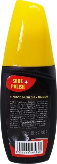 Tên sản Phẩm : Xi nước đánh giày da nhanh Hando 80ml Công dụng: Giúp đánh bóng,bảo vệ màu chống thấm nước, làm mờ các vết trầy xước trên giày túy ví da. Thành Phần : Polyethylene wax , acrylate, polysorbate esters , iron oxides , glycols Thể tích thực : 80g Trọng lượng : 100g Màu sắc : Đen, Nâu TCCS : 12:2020/HSHN Kích thước :  15,5 x 5,5 x 3 cm Ngày sản xuất / Hạn sử dụng : In trên bao bì sản phẩm Xuất xứ : Việt Nam Bảo quản : Để nơi thoáng mát , tránh xa tầm với trẻ em .Đậy nắp sau khi sử dụng.