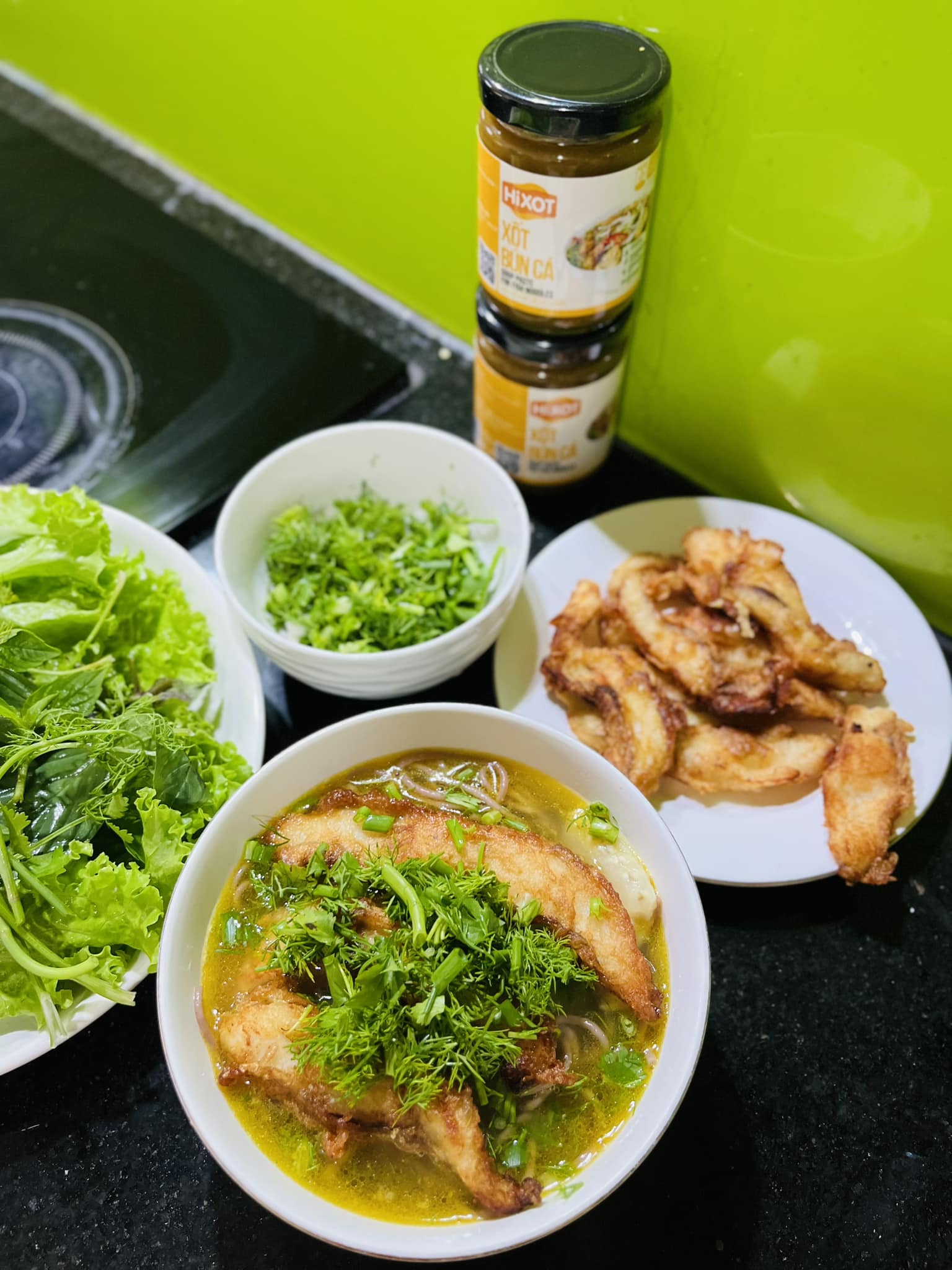 Bước 4: Xếp bún, cá đã xào và rau lên tô, chan nước dùng và thưởng thức