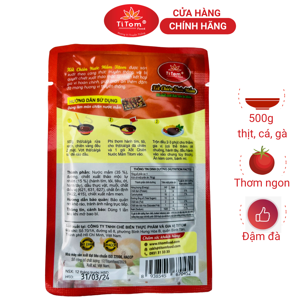 - THÔNG TIN SẢN PHẨM -Xốt chiên nước mắm Titom là gia vị nêm sẵn hoàn chỉnh dùng để chế biến món chiên nước mắm thơm ngon chuẩn vị, không cần nêm nếm. Đa năng, có thể dùng chiên thịt, cá, gà. -Sản phẩm mang hương vị chiên nước mắm truyền thống, với bí quyết chiết xuất thảo mộc tự nhiên kết hợp gia vị hoàn chỉnh, giúp món ăn thêm đậm đà, thơm ngon, đậm vị mà không tốn quá nhiều thời gian của bạn.