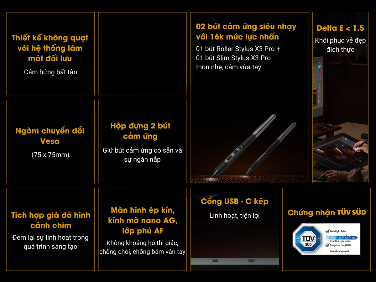 - Màn Hình 4K UHD Calman Verified Độ phân giải sắc nét: Với độ phân giải 4K UHD 3840 x 2160, XP-PEN Artist Pro 19 (Gen 2) mang đến hình ảnh cực kỳ chi tiết, đảm bảo mọi đường nét và sắc thái màu đều sắc nét và sống động. Tỷ lệ khung hình 16:9 hoàn hảo. Chứng nhận Calman Verified: Chứng nhận này khẳng định sản phẩm đáp ứng tiêu chuẩn hiển thị màu sắc chính xác. Đây là yếu tố quan trọng với các nhà thiết kế và nhiếp ảnh gia, đảm bảo hình ảnh và màu sắc hiển thị đúng với ý đồ sáng tạo. Độ phủ màu rộng: Chuyển đổi giữa 3 không gian màu sRGB/ Adobe RGB/Display P3; cùng khả năng hiển thị 1.07 tỷ màu. Giúp màu sắc hiển thị chân thực và sống động, lý tưởng cho các dự án thiết kế yêu cầu độ chính xác cao về màu sắc. Màn hình X-nature: Trên XP-Pen Artist Pro 19 (Gen 2) là một công nghệ tiên tiến giúp cải thiện chất lượng hiển thị hình ảnh. Với khả năng tái tạo màu sắc chân thực và độ sáng cao, màn hình X-nature giúp người dùng có thể làm việc trong nhiều điều kiện ánh sáng khác nhau mà không bị phản chiếu hay lóa. Công nghệ này mang đến độ tương phản tuyệt vời, phù hợp cho những công việc đòi hỏi sự chính xác về màu sắc như thiết kế đồ họa và chỉnh sửa ảnh. Thiết kế siêu mỏng chỉ 21.5 mm thực sự là một bước đột phá. Màn hình lớn hơn. Chiếm ít không gian làm việc hơn. Đem lại trải nghiệm vẽ thú vị hơn.
