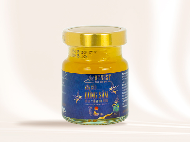 30% yến sào, 1% hồng sâm, 1% đông trùng hạ thảo, mật ong, hương hồng sâm tự nhiên.