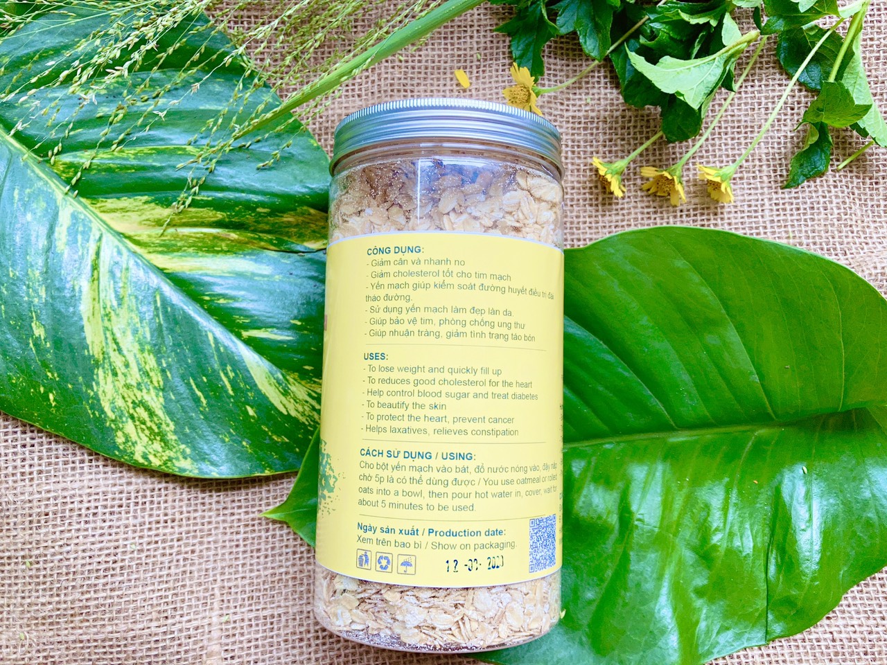 CÔNG DỤNG CỦA YẾN MẠCH: Giúp giảm cân Tốt cho tim mạch. Sử dụng yến mạch làm đẹp làn da.  Giúp bảo vệ tim, phòng chống ung thư .  Ăn yến mạch giúp nhuận tràng, giảm tình trạng táo bón. USES: Eat oats to lose weight and quickly fill up. Eating oats reduces good cholesterol for the heart.  Use oats to beautify the skin.  Help protect the heart, prevent cancer. Eating oats helps laxatives, relieves constipation. Thành phần dinh dưỡng yến mạch trong 100 gam yến mạch ăn được:  Năng lượng: 389 kcal.  Nước: 8% Protein: 16.9 gam.  Carbs: 66.3 gam.  Đường: 0 gam.  Chất xơ: 10.6 gam.  Chất béo: 6.9 gam. Nutritional composition of oats in 100 grams of edible oats:  Energy: 389 kcal.  Water: 8%  Protein: 16.9 grams.  Carbs: 66.3 grams.  Sugar: 0 grams.  Fiber: 10.6 grams.  Fat: 6.9 grams.