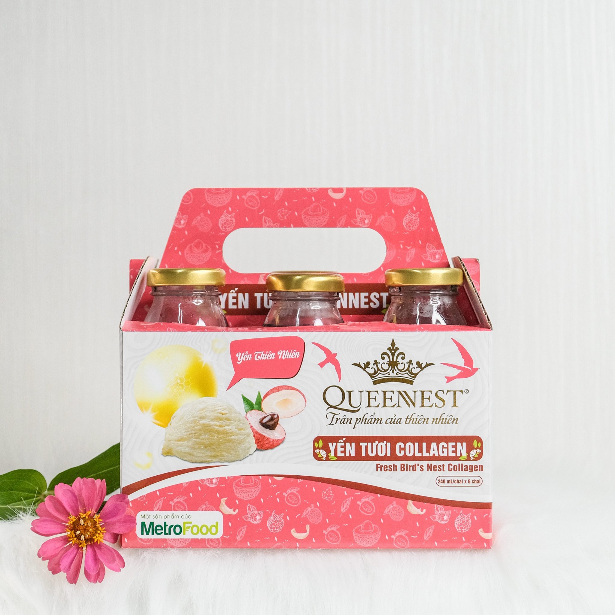 Yến Sào Tươi QUEENNEST - chai 240ml, gồm 5 vị: Hạt Chia, Hồng Sâm, Collagen, Vanilla, Nha Đam Quy cách đóng gói: - Hộp 6 hũ : có bao bì hộp Đối tượng sử dụng: