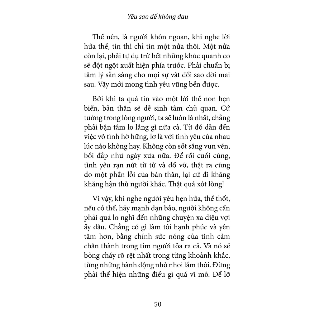 Tin rằng “Yêu sao để không đau” sẽ đồng hành cùng bạn đi qua những năm tháng đơn độc lẻ loi, bước vào tình yêu không sợ hãi, rời khỏi tình yêu cũng thật rạng rỡ và can đảm viết tiếp hành trình mới.
