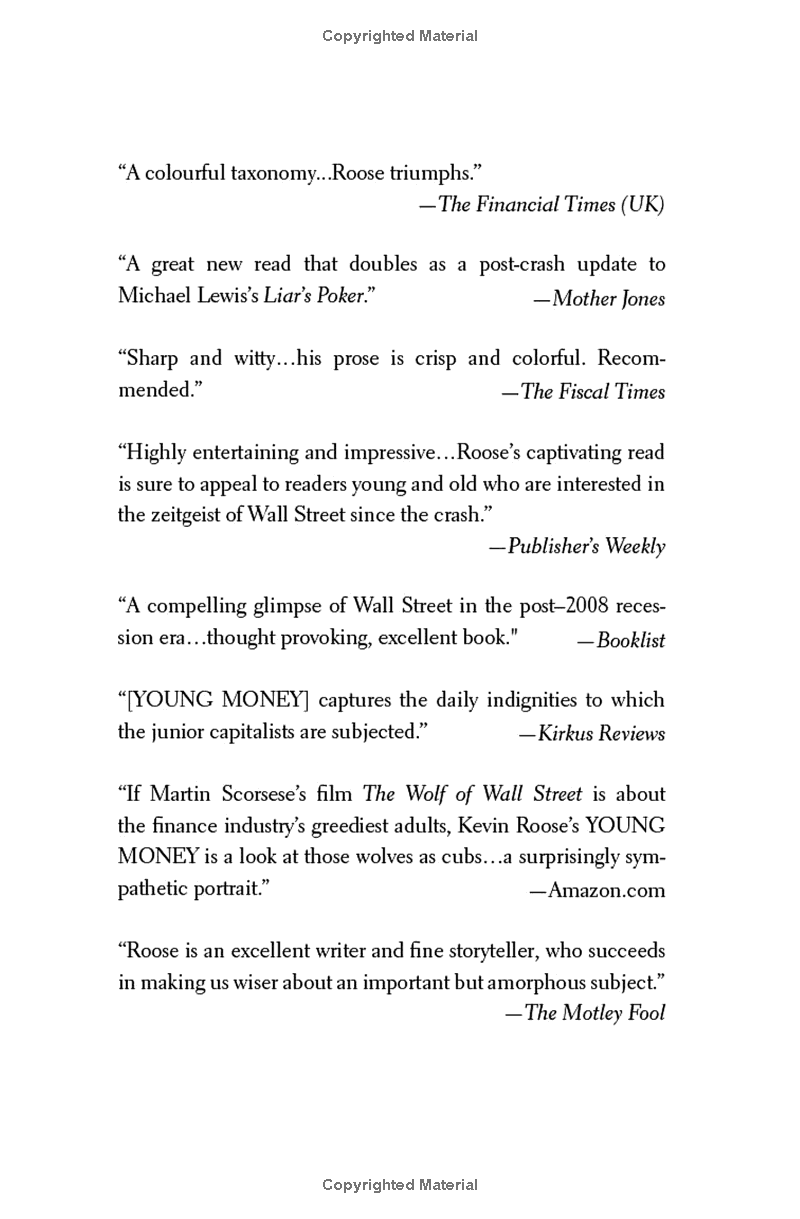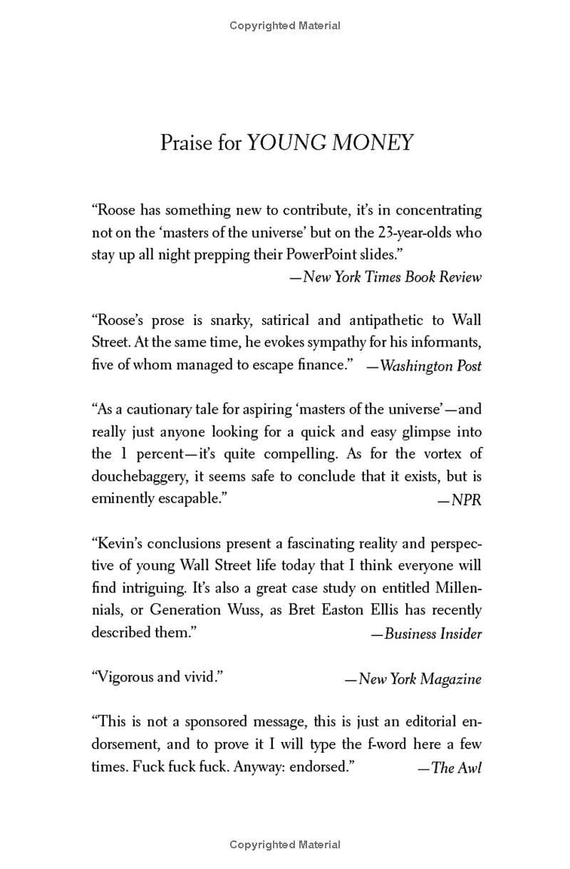 Young Money is the inside story of this well-guarded world. Kevin Roose, New York magazine business writer and author of the critically acclaimed The Unlikely Disciple, spent more than three years shadowing eight entry-level workers at Goldman Sachs, Bank of America Merrill Lynch, and other leading investment firms. Roose chronicled their triumphs and disappointments, their million-dollar trades and runaway Excel spreadsheets, and got an unprecedented (and unauthorized) glimpse of the financial world's initiation process.